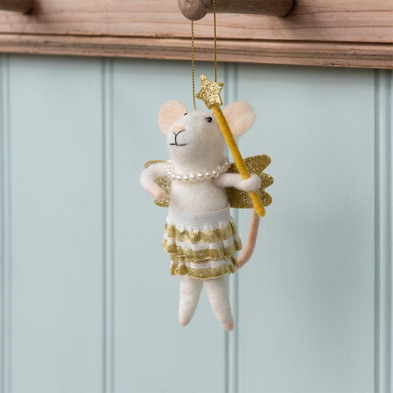 Очаровательная мышка на елку с золотистыми крылышками и в жемчужном ожерелье. Творит чудеса. Для этого и палочка волшебная имеется.