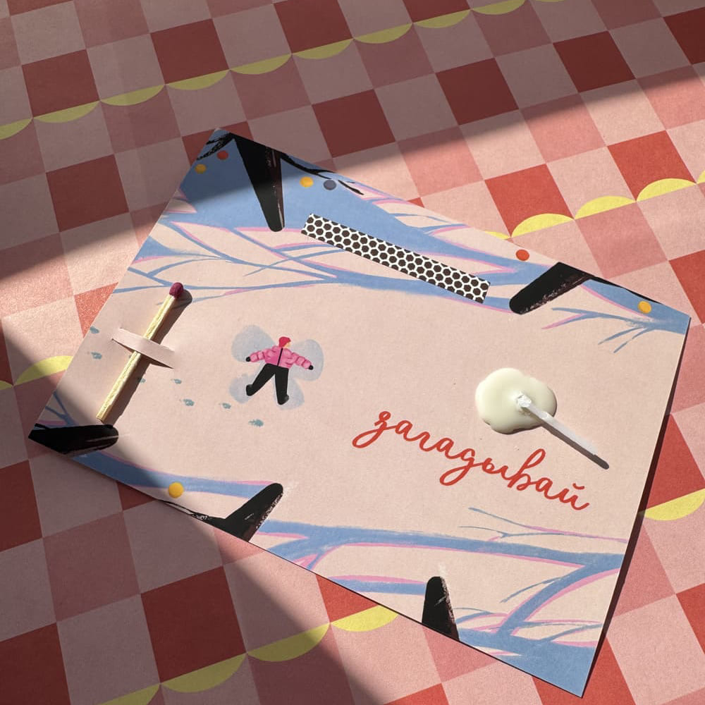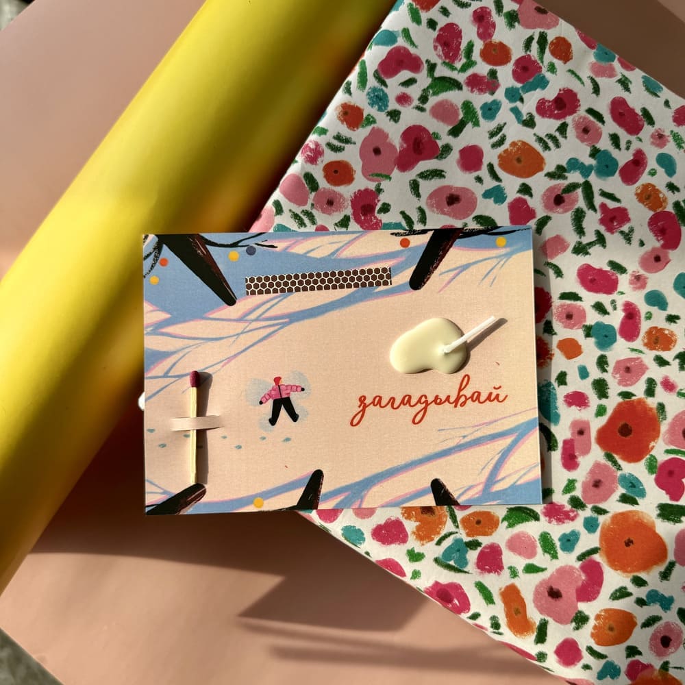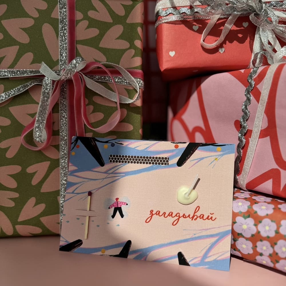 Распакуйте открытку, достаньте спичку из крепления. Проведите спичкой по терке на открытке. Подожгите фитиль свечки. Загадайте желание и задуйте свечку. Ждите исполнения.