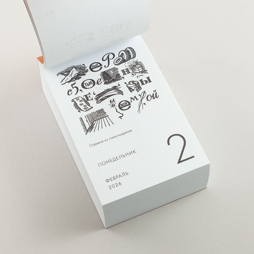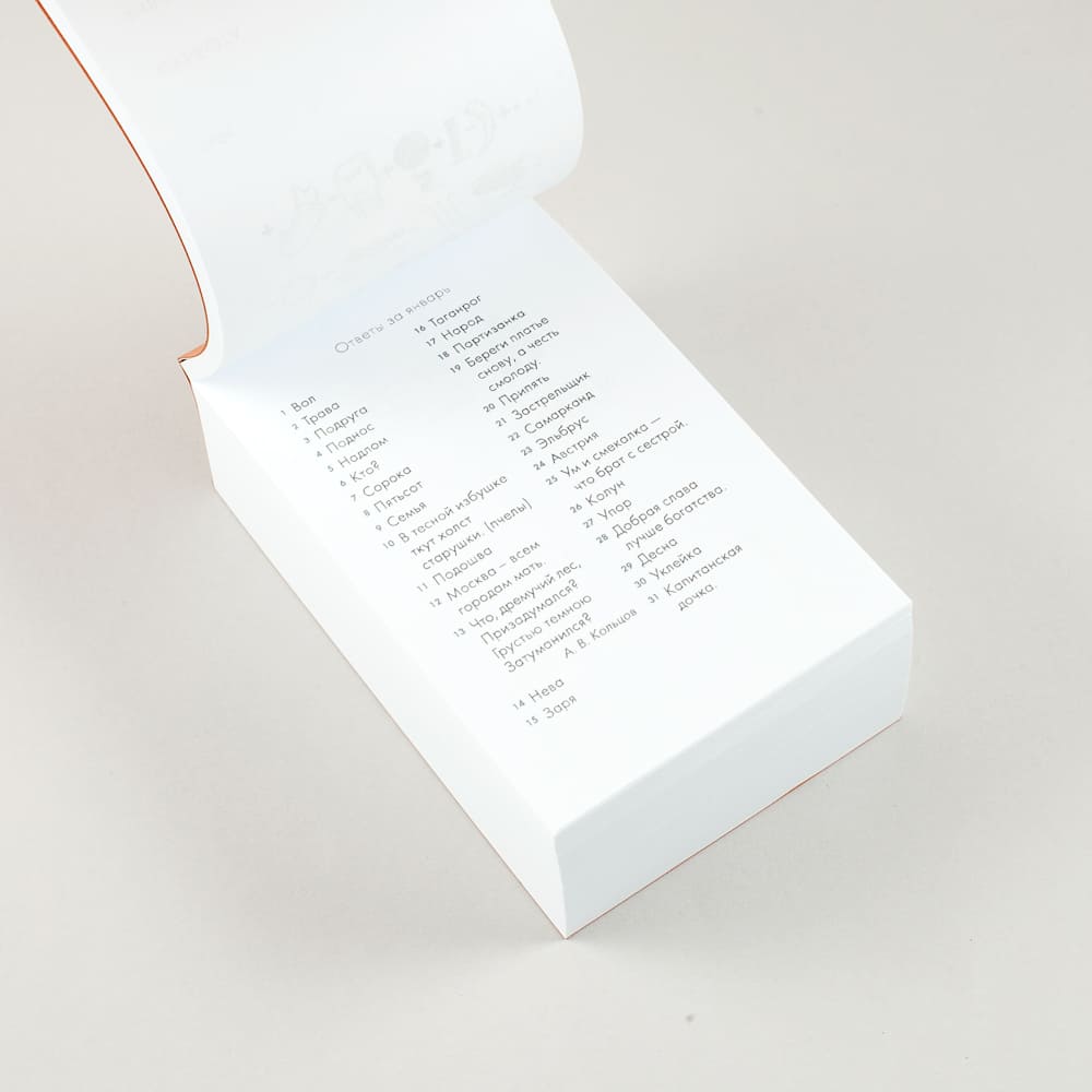 - Переплет: Клеевой сверху календаря. Данный переплет рассчитан только на отрывание листочков по одному. Если листать и раскрывать календарь как книгу, то переплет может не выдержать и разломиться.