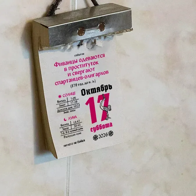 Напечатан на единственной в России типографии, которая ещё с 1980-х поставляет все лунные календари дачника в каждый ларёк и каждое отделение почты. (Только теперь им пришлось напечатать рецепт колдовского зелья, чтобы улететь на стуле, и пошлый стишок из II века до н.э.)