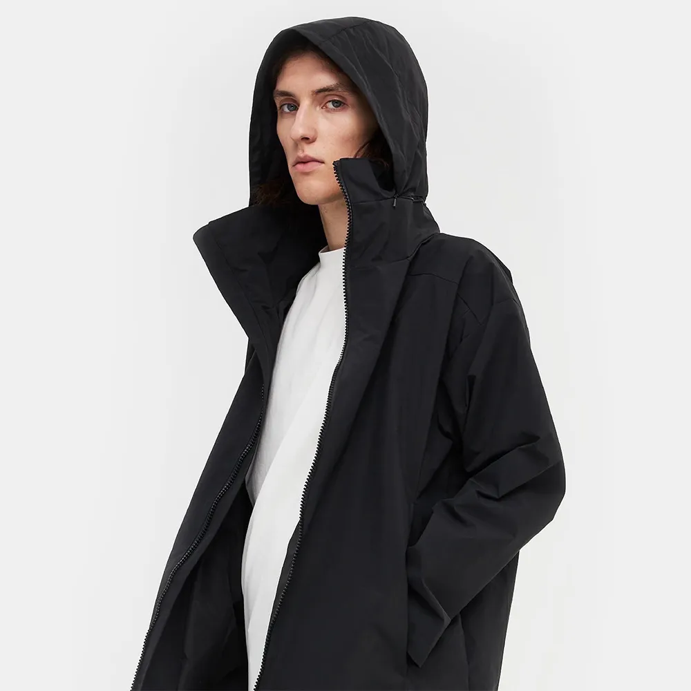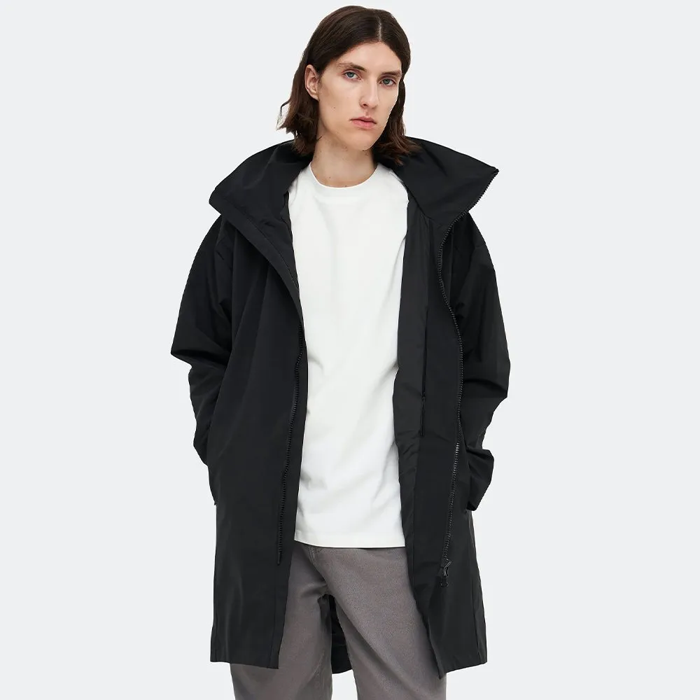Дождевик прямого силуэта из непромокаемой ткани с высоким воротом и скрытым капюшоном.