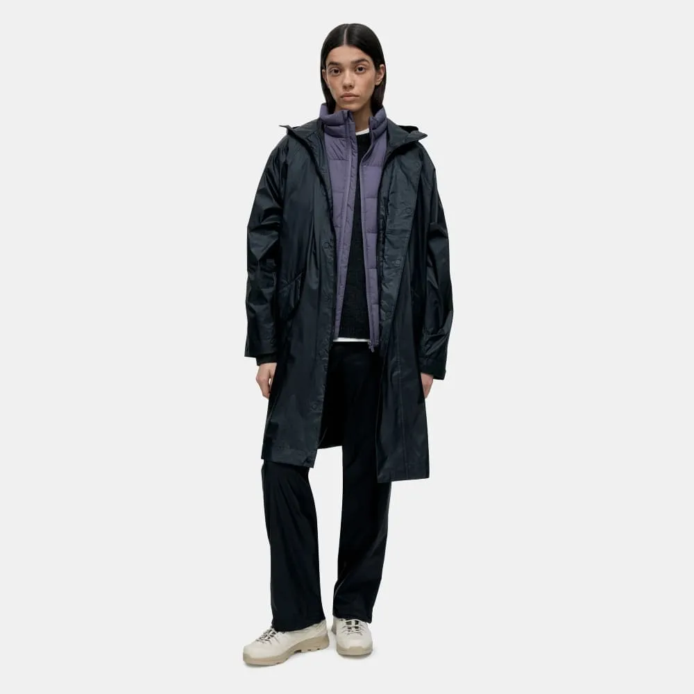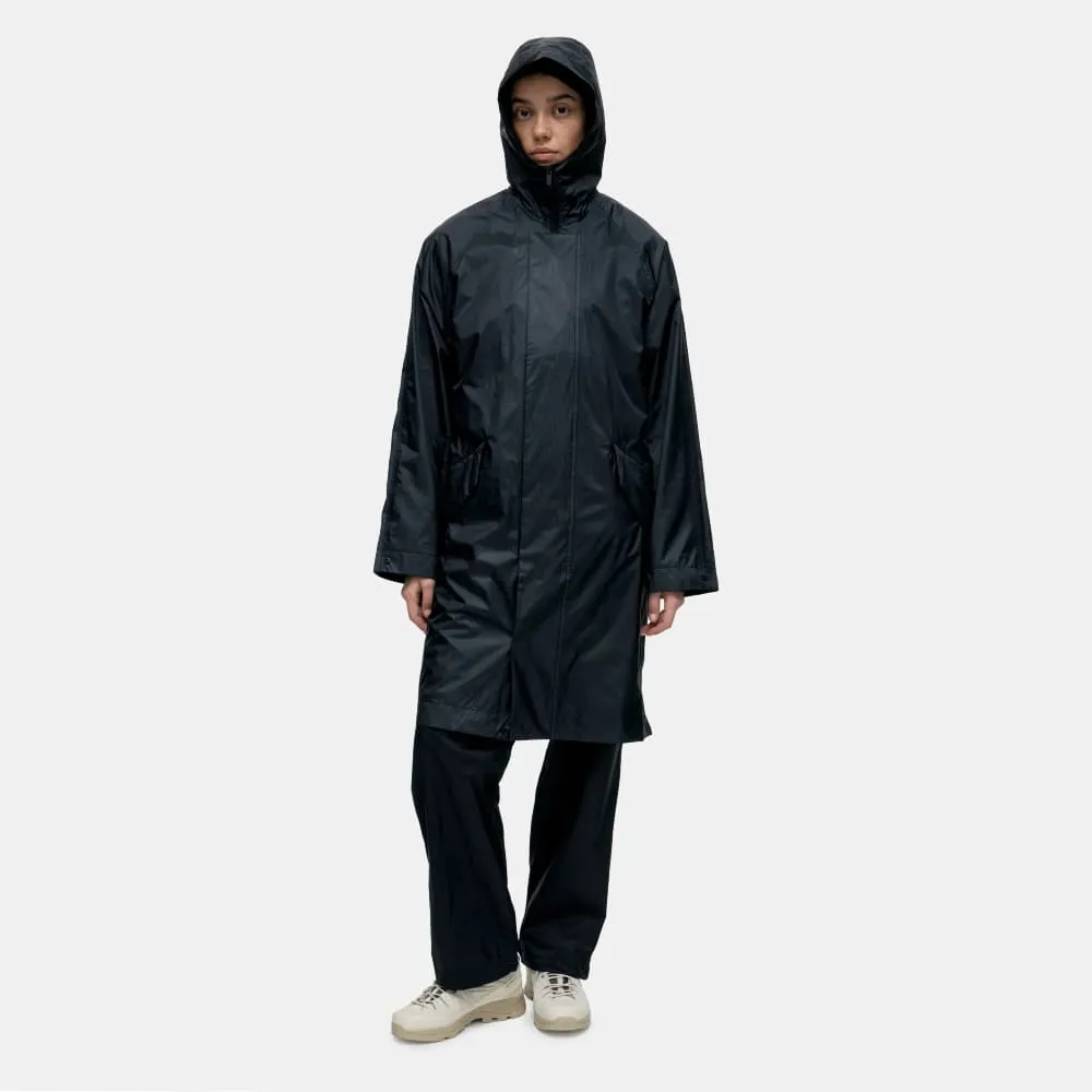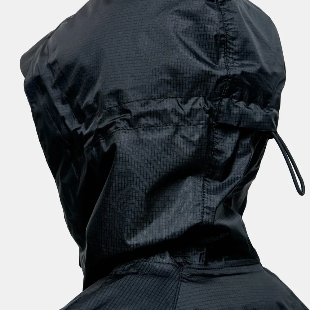 Плащ свободного кроя из ткани рипстоп с капюшоном. Как и всегда, всё предусмотрено для комфорта и функциональности. Молнии закрыты планками на магнитах. Кулиска на талии позволяет регулировать посадку, а кнопки на манжетах — ширину рукавов. И последнее, уж точно не по значимости: плащ складывается в компактный мешок.