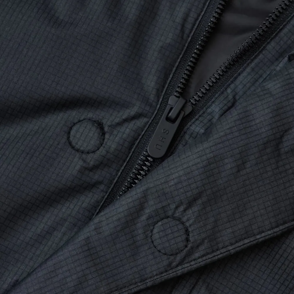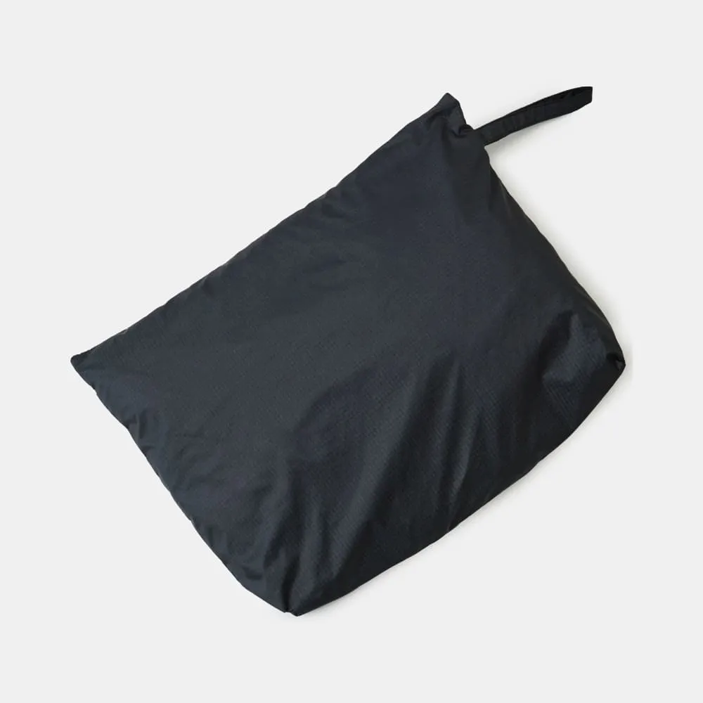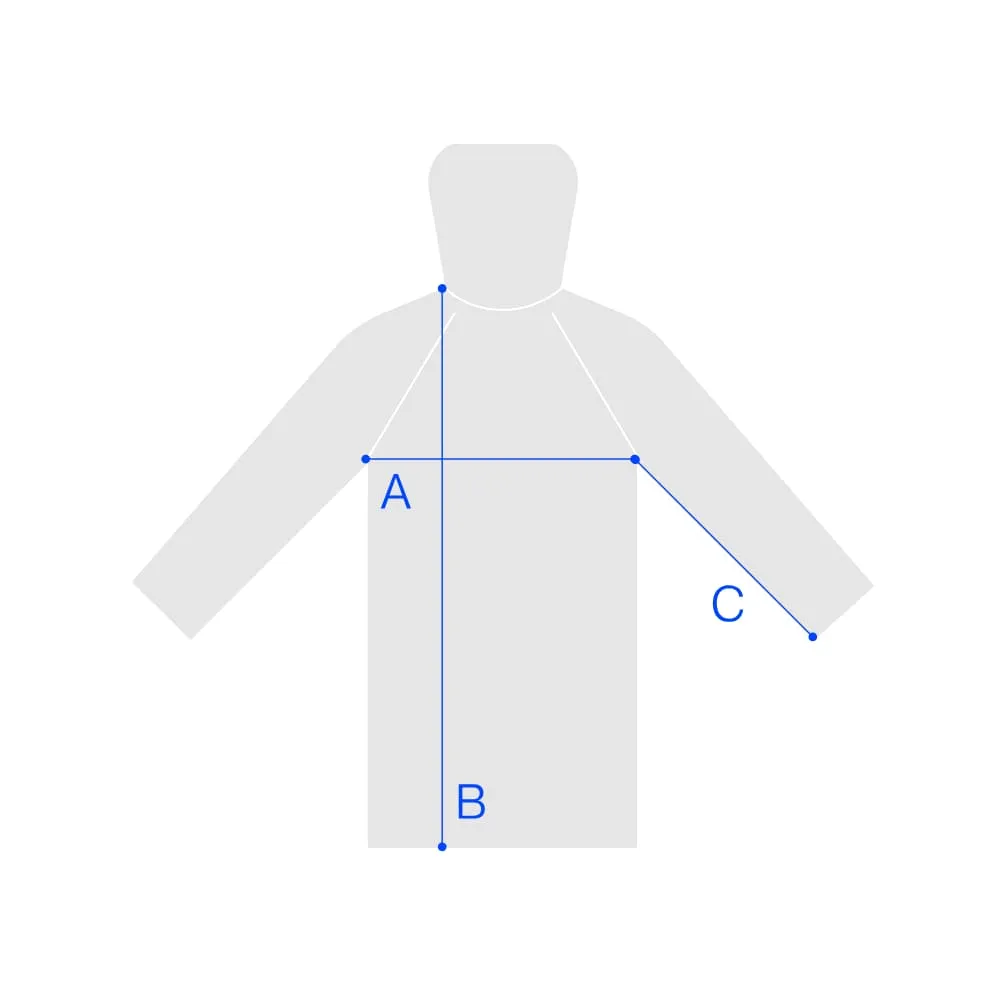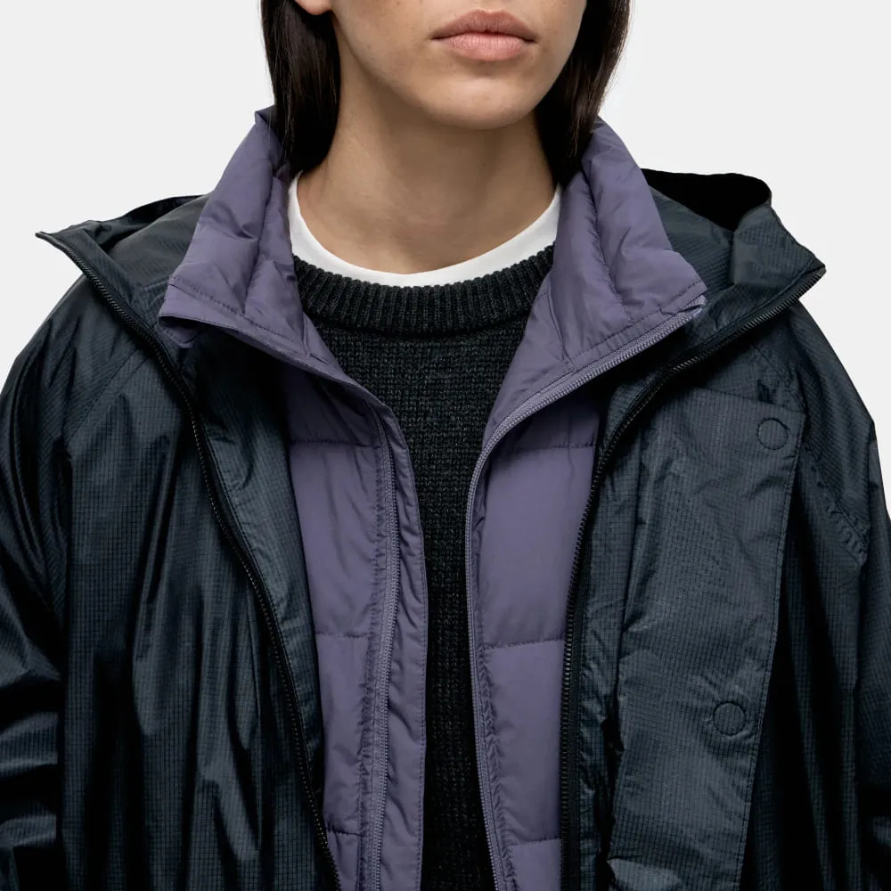 Плащ свободного кроя из ткани рипстоп с капюшоном. Как и всегда, всё предусмотрено для комфорта и функциональности. Молнии закрыты планками на магнитах. Кулиска на талии позволяет регулировать посадку, а кнопки на манжетах — ширину рукавов. И последнее, уж точно не по значимости: плащ складывается в компактный мешок.