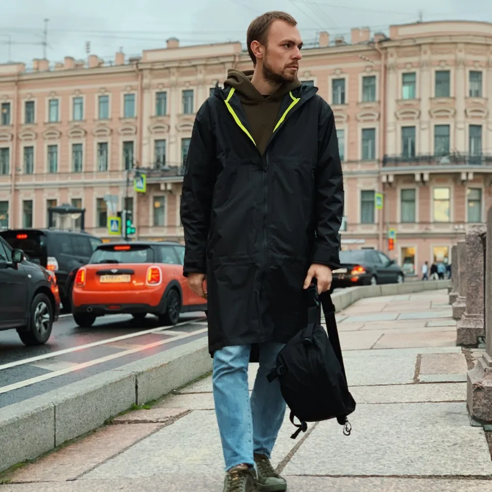 - Внутри к подкладу пристегивается маленькая сумка-чехол, в которую при желании можно компактно свернуть плащ.