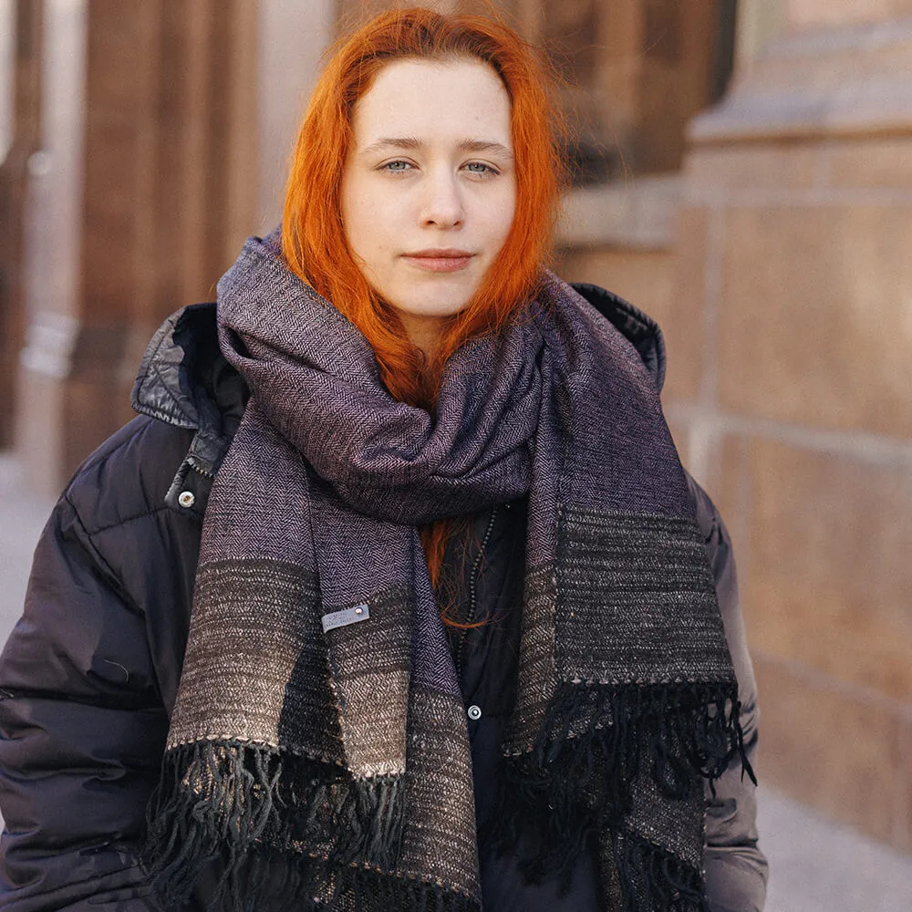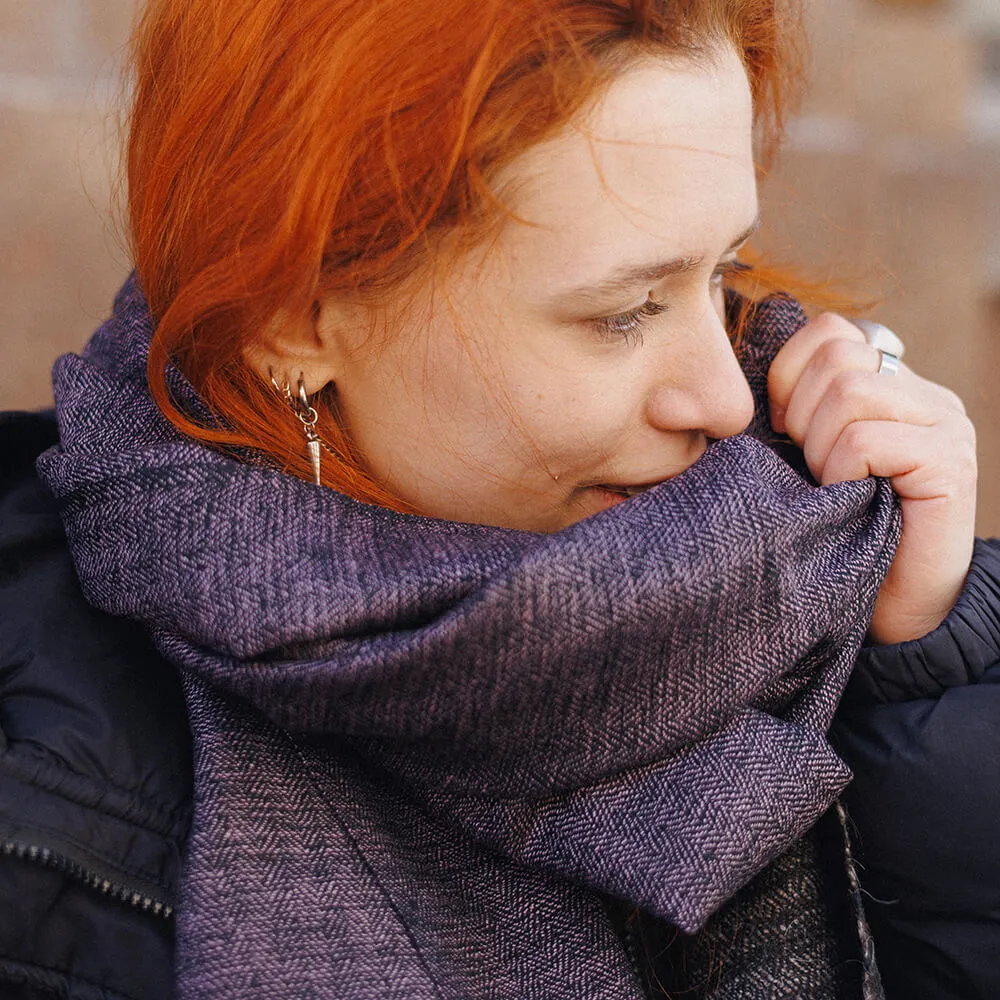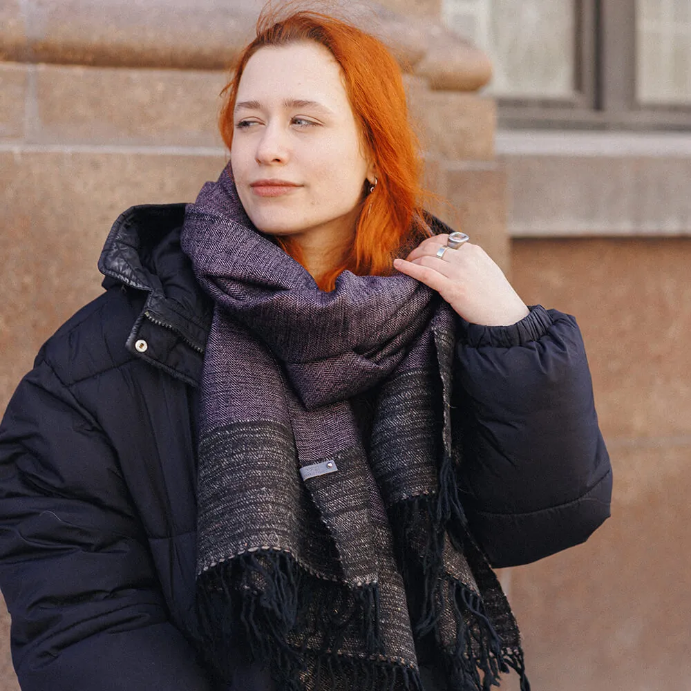 Тёплый и красивый шарф сотканный в классическую елочку пыльно-лилового цвета с меланжевой полосой для сохранения тепла в душе и теле.