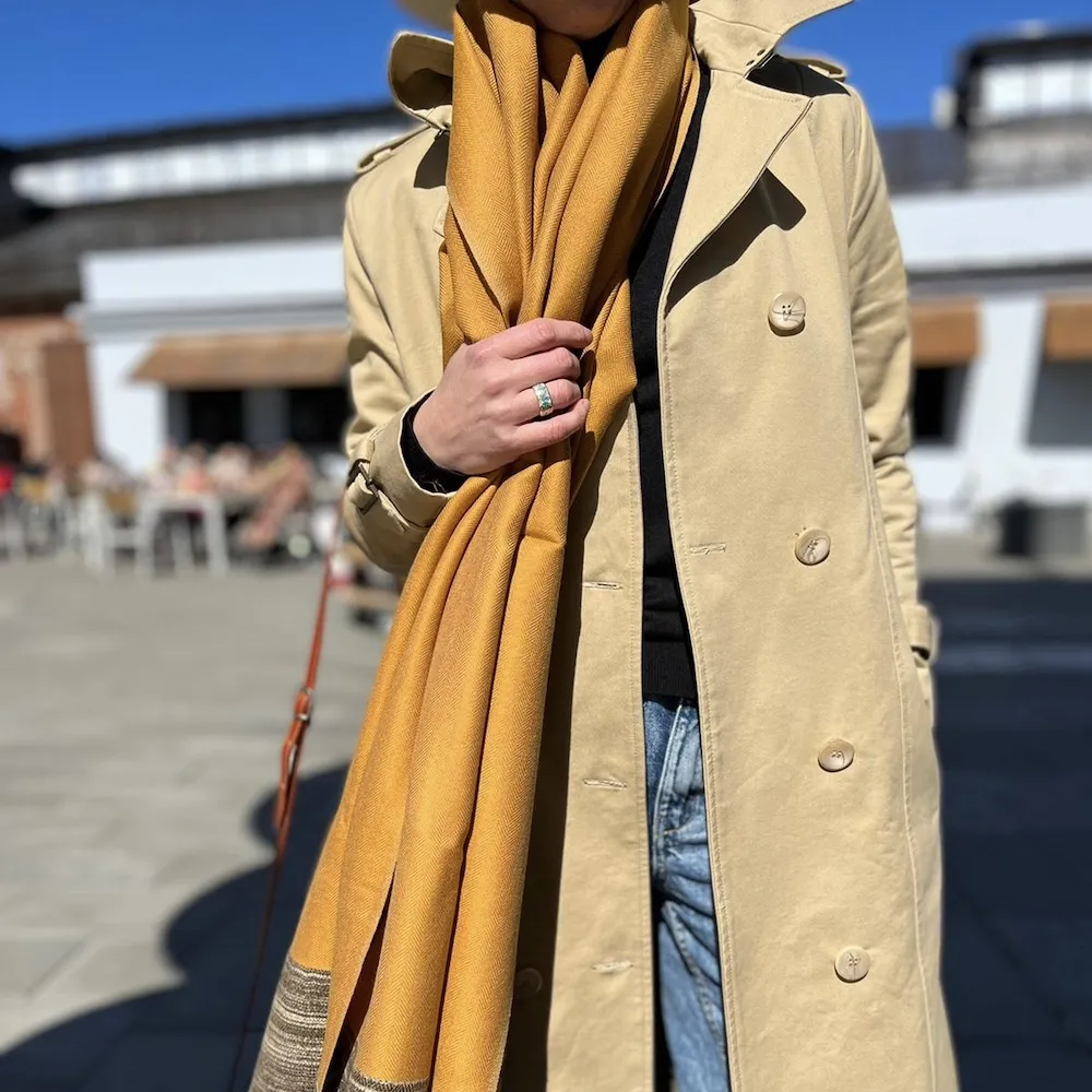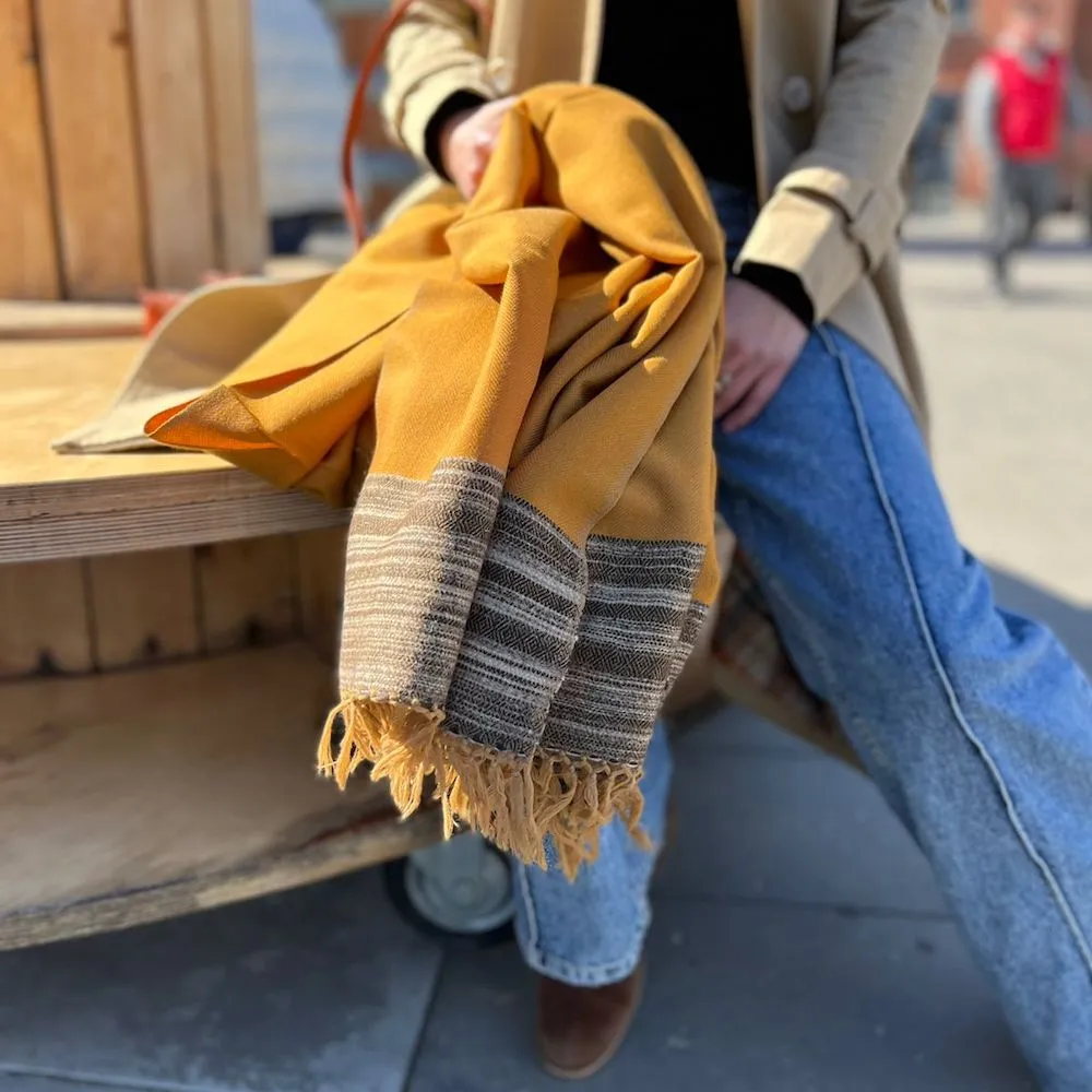 Тёплый и красивый янтарно-горчичный шарф с меланжевой полосой для сохранения тепла в душе и теле.