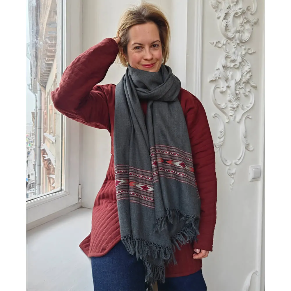 Тёплый и красивый темно-серый шарф с традиционным гималайским орнаментом для сохранения тепла в душе и теле.