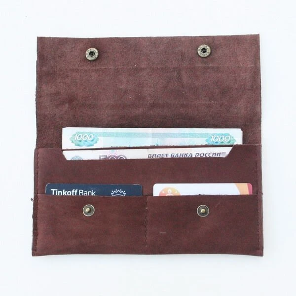 - Внутри два отделения для купюр (вмещает паспорт и телефон) и два отделения для пластиковых карт.