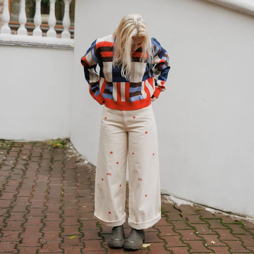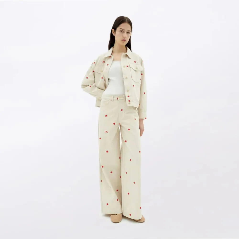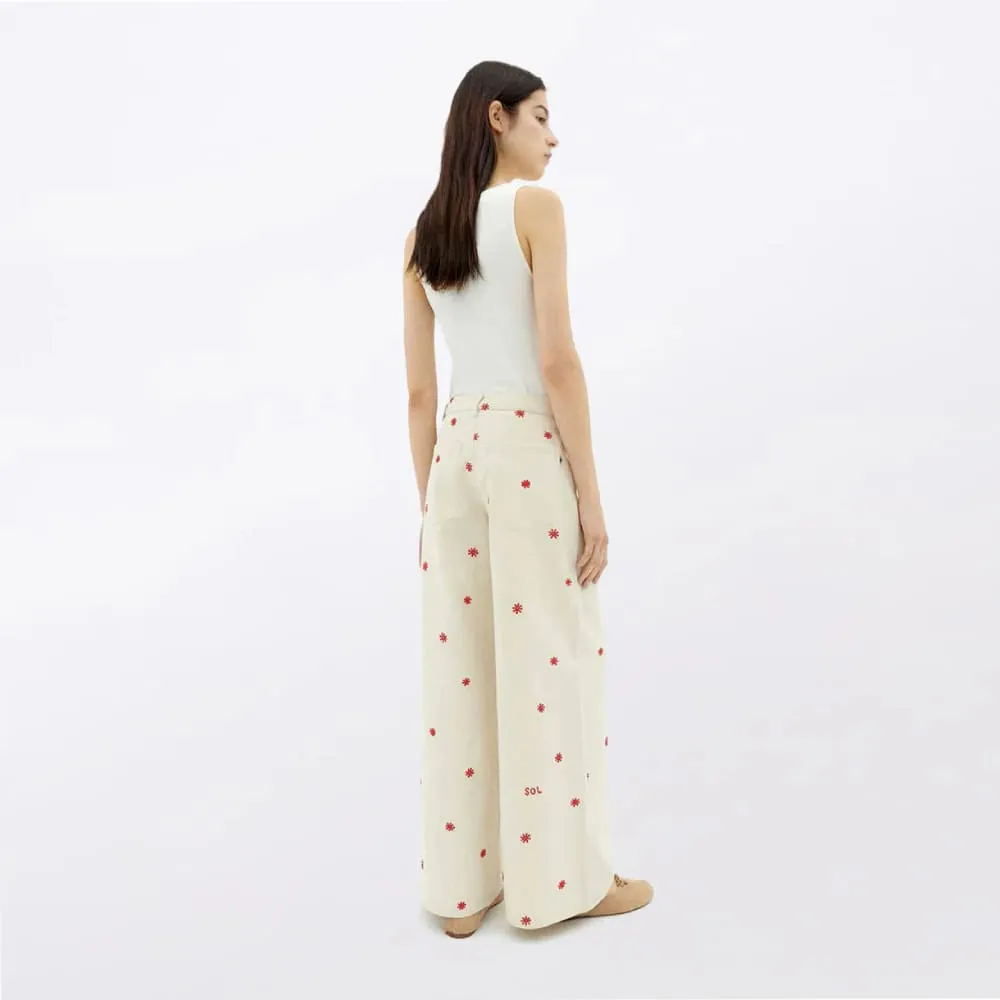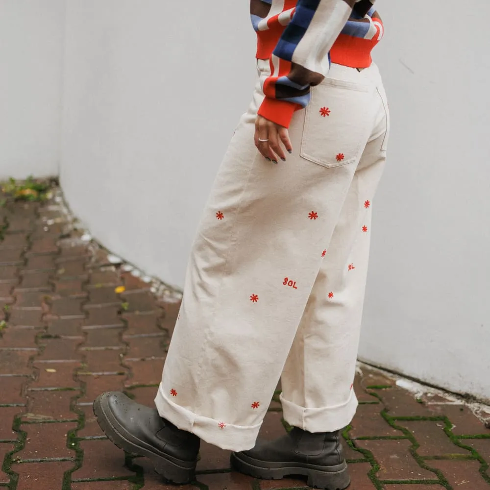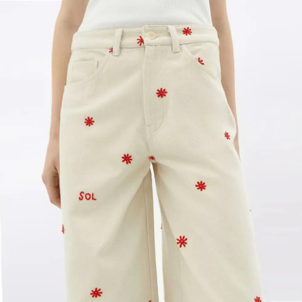 Белые брюки с вышитыми солнышками из органического хлопка от испанского бренда Thinking Mu.