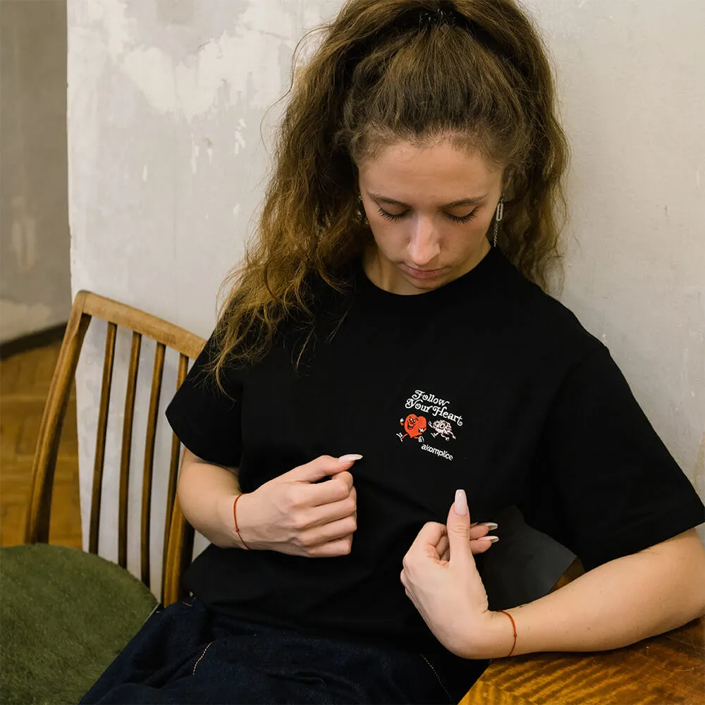 Приятная черная футболка Follow Your Heart из органического хлопка американской марки AKOMPLICE.