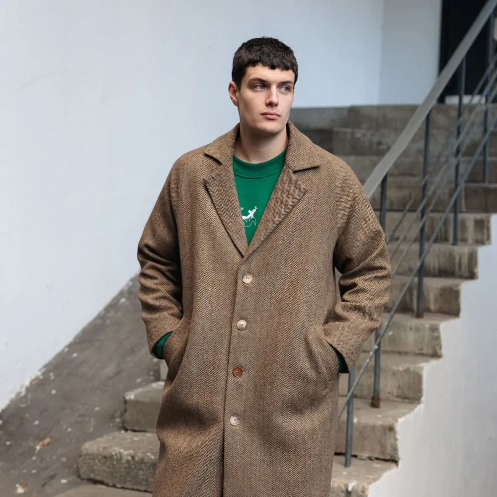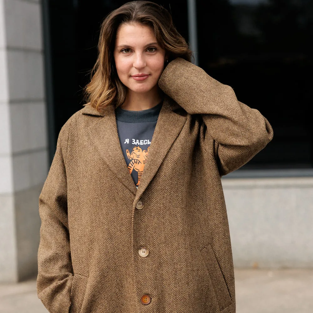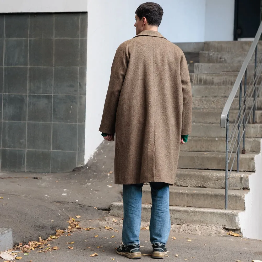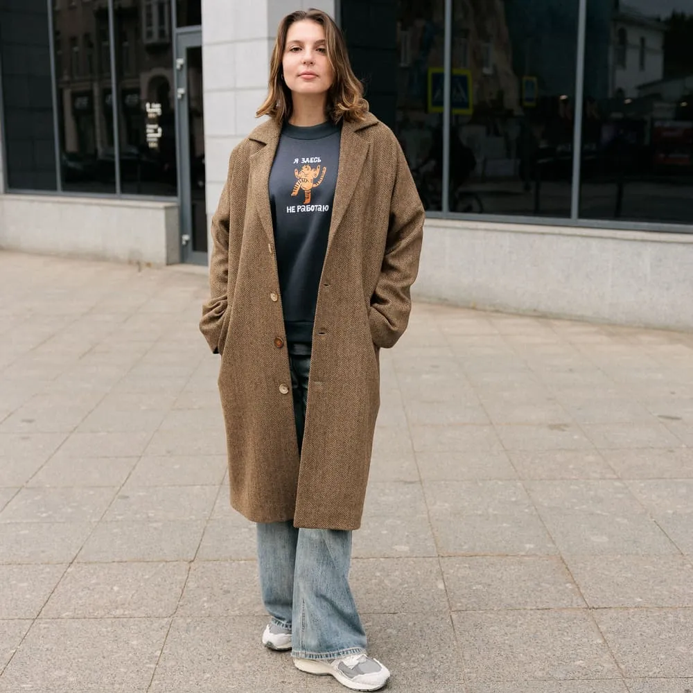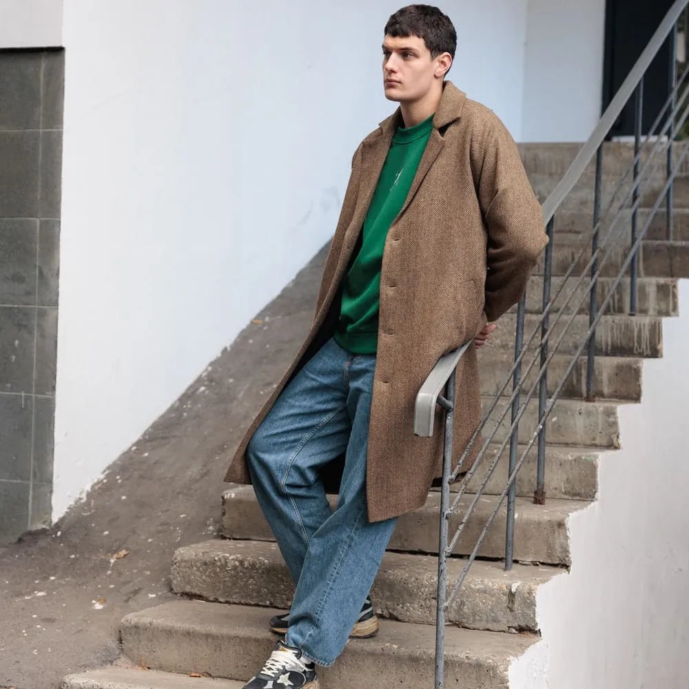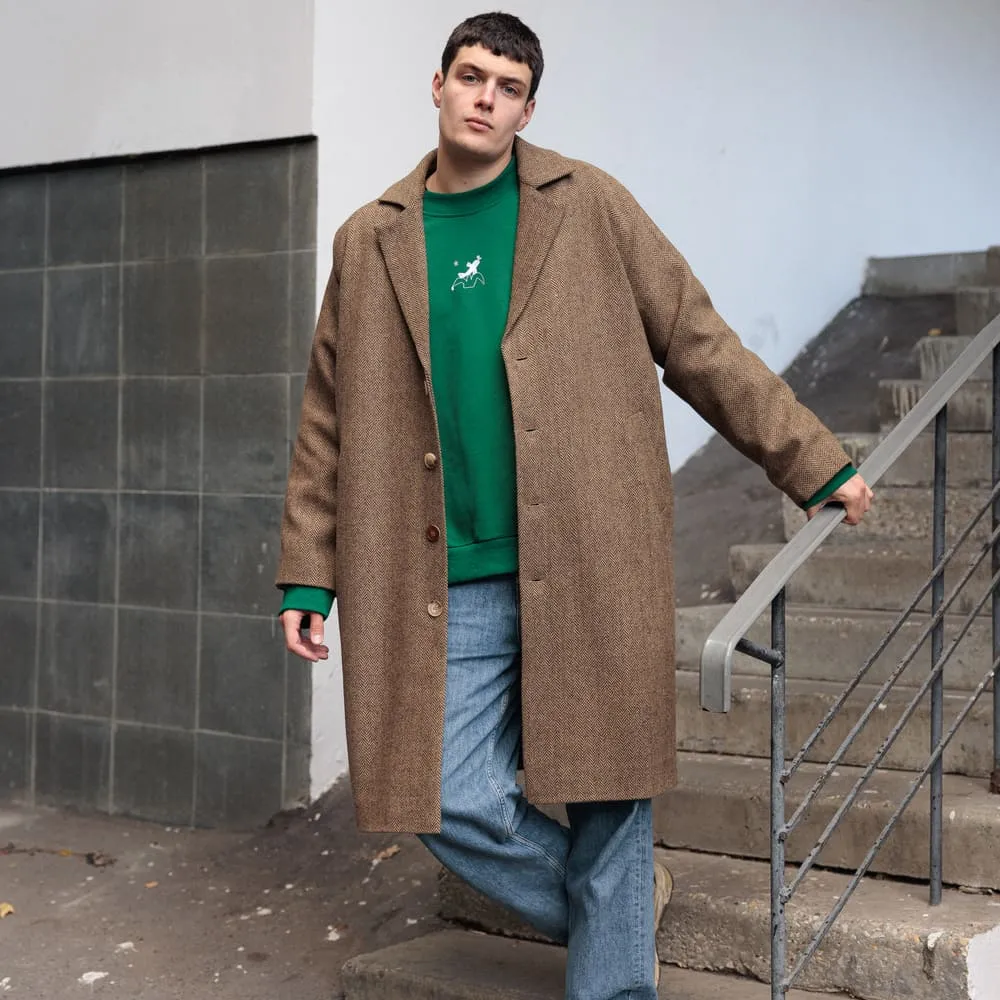 Наша гордость – однобортное пальто собственного производства Friend Function. Натуральная шерсть, высокий воротник с лацканами, застежка на пуговицы и узор елочка. Настоящая находка для человека любой формации – серьезного юриста, модного бариста или трушного петербуржца.