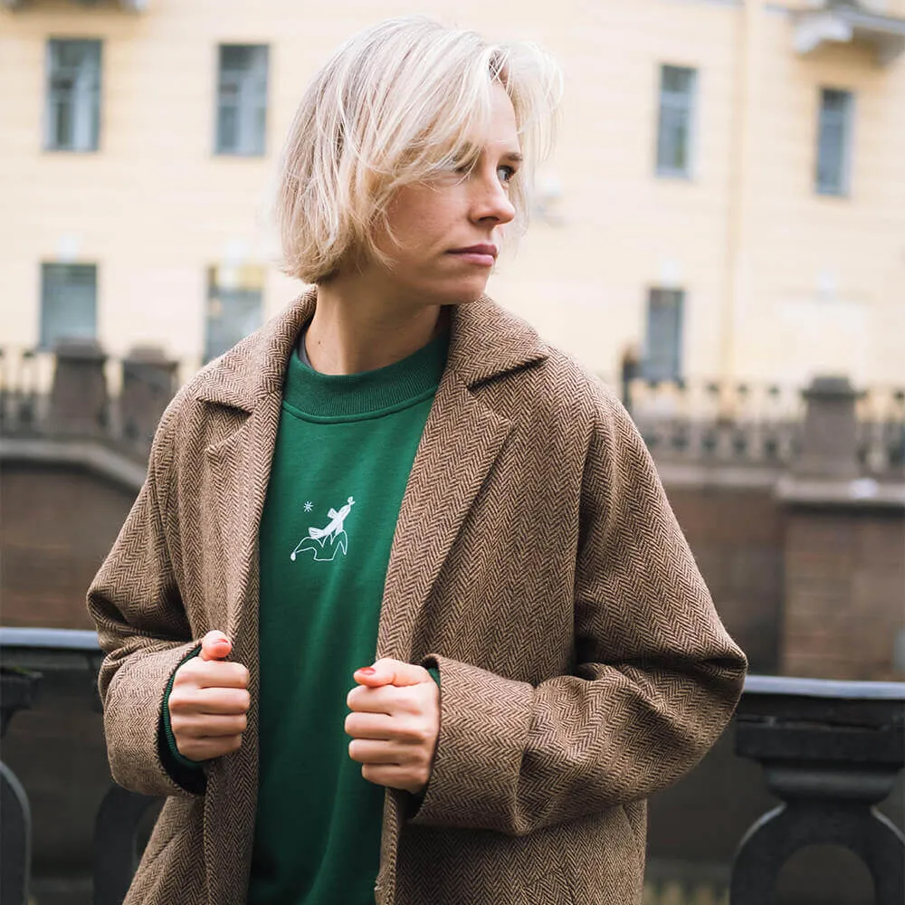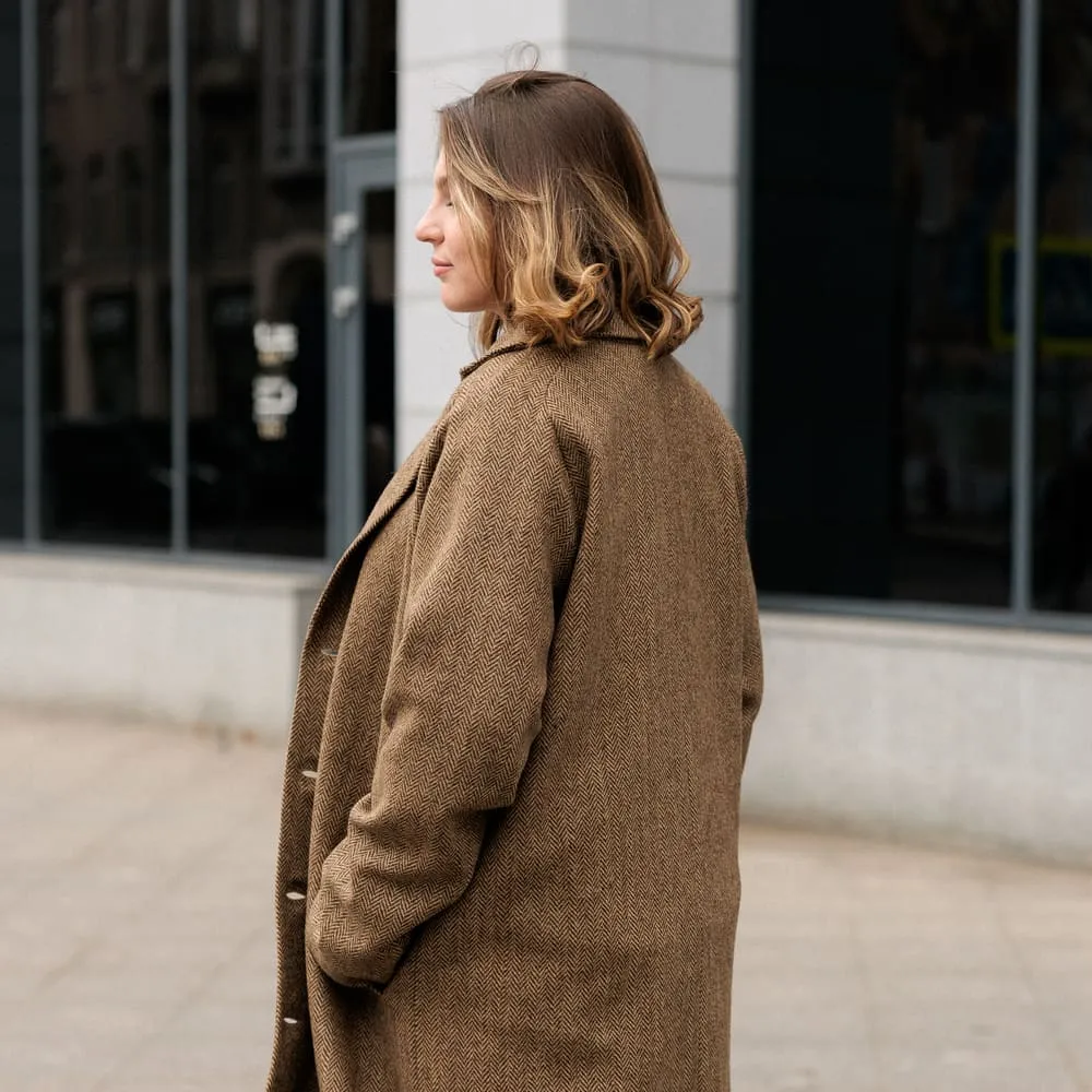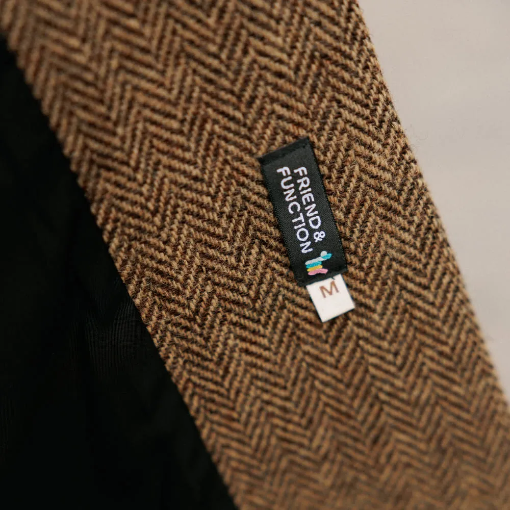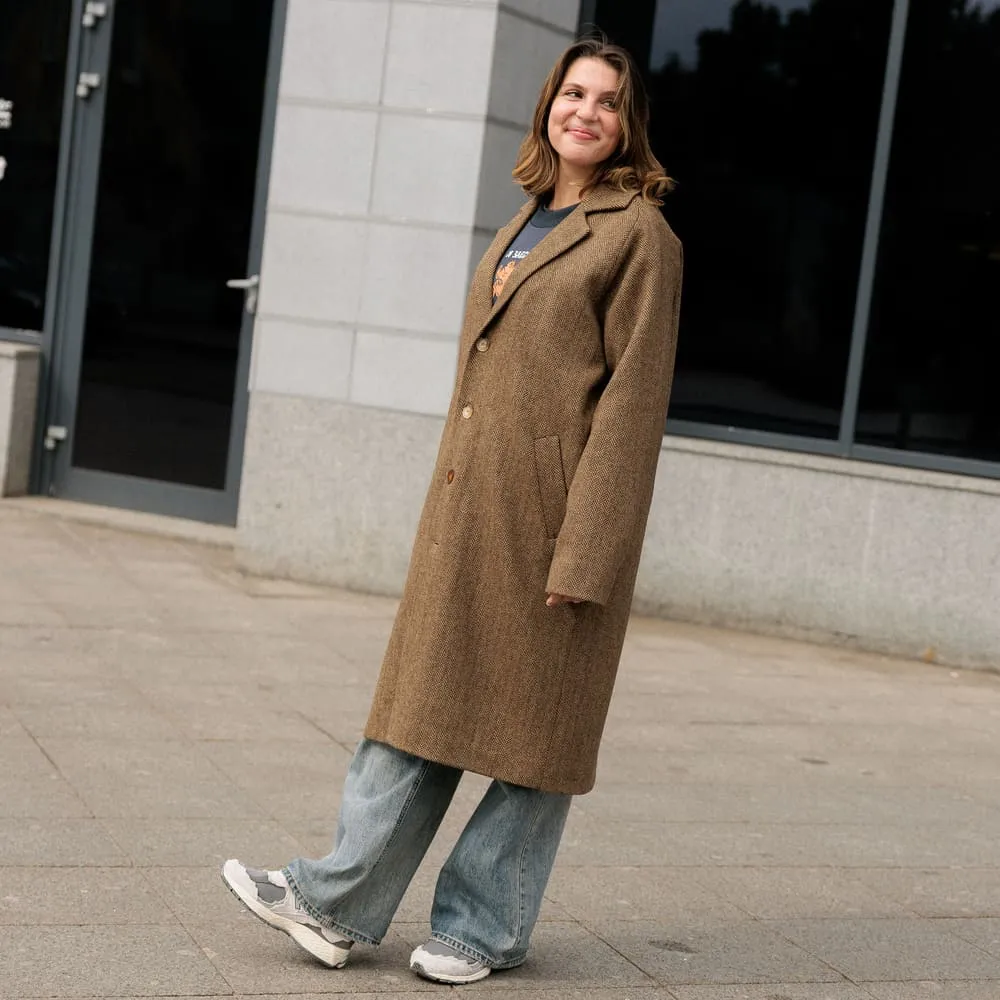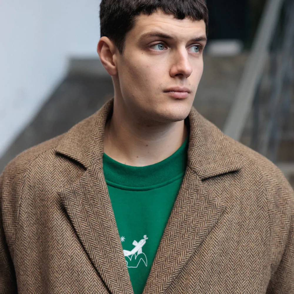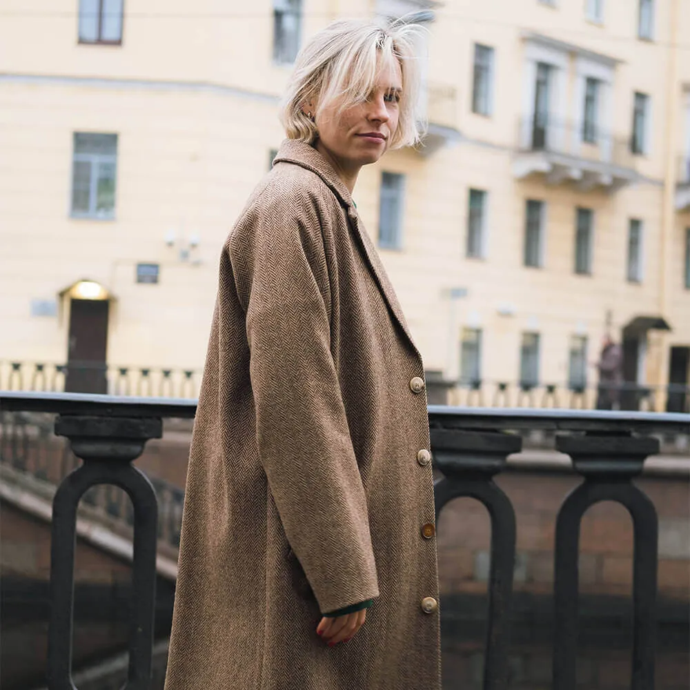 Наша гордость – однобортное пальто собственного производства Friend Function. Натуральная шерсть, высокий воротник с лацканами, застежка на пуговицы и узор елочка. Настоящая находка для человека любой формации – серьезного юриста, модного бариста или трушного петербуржца.