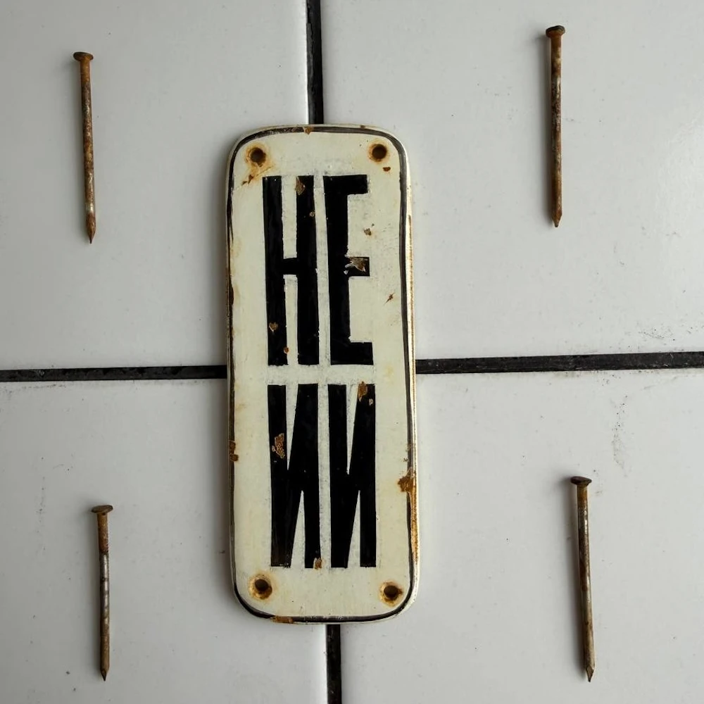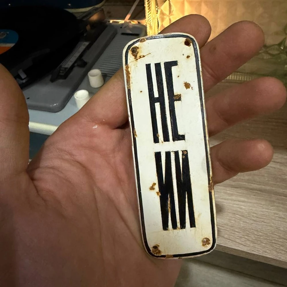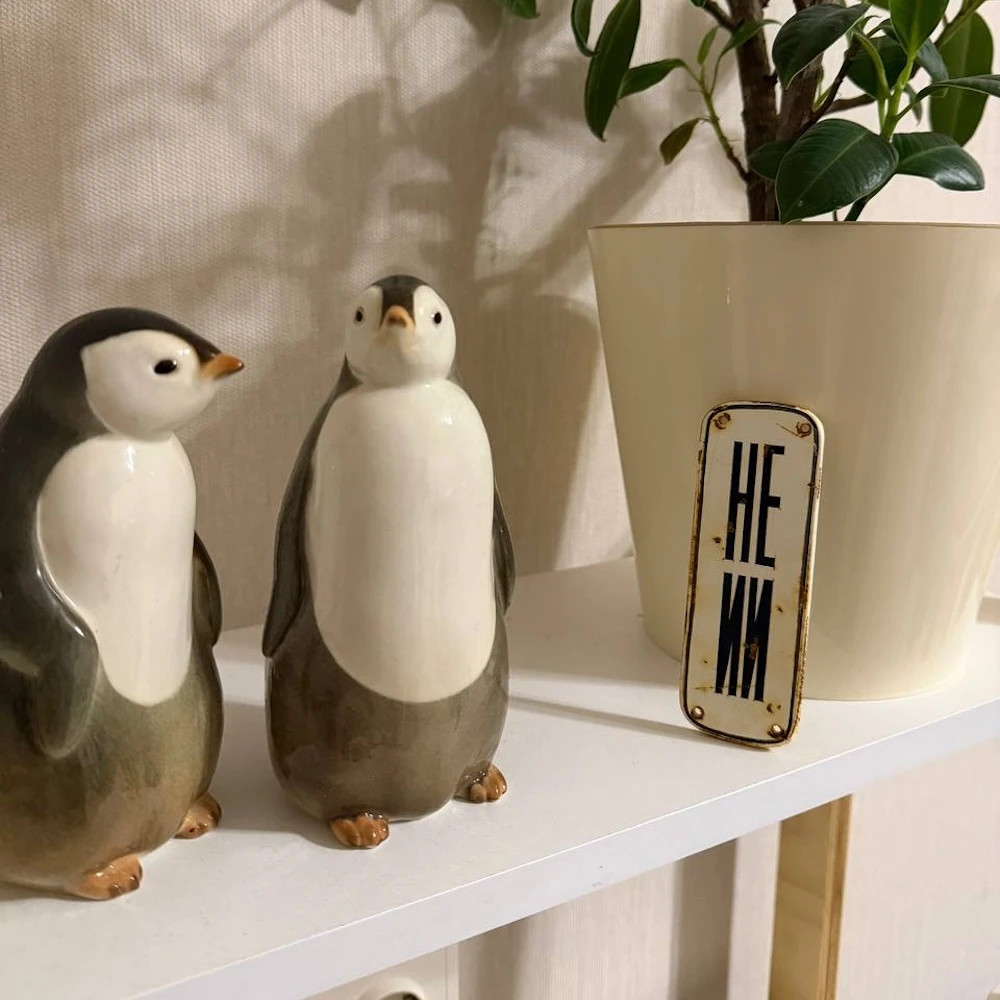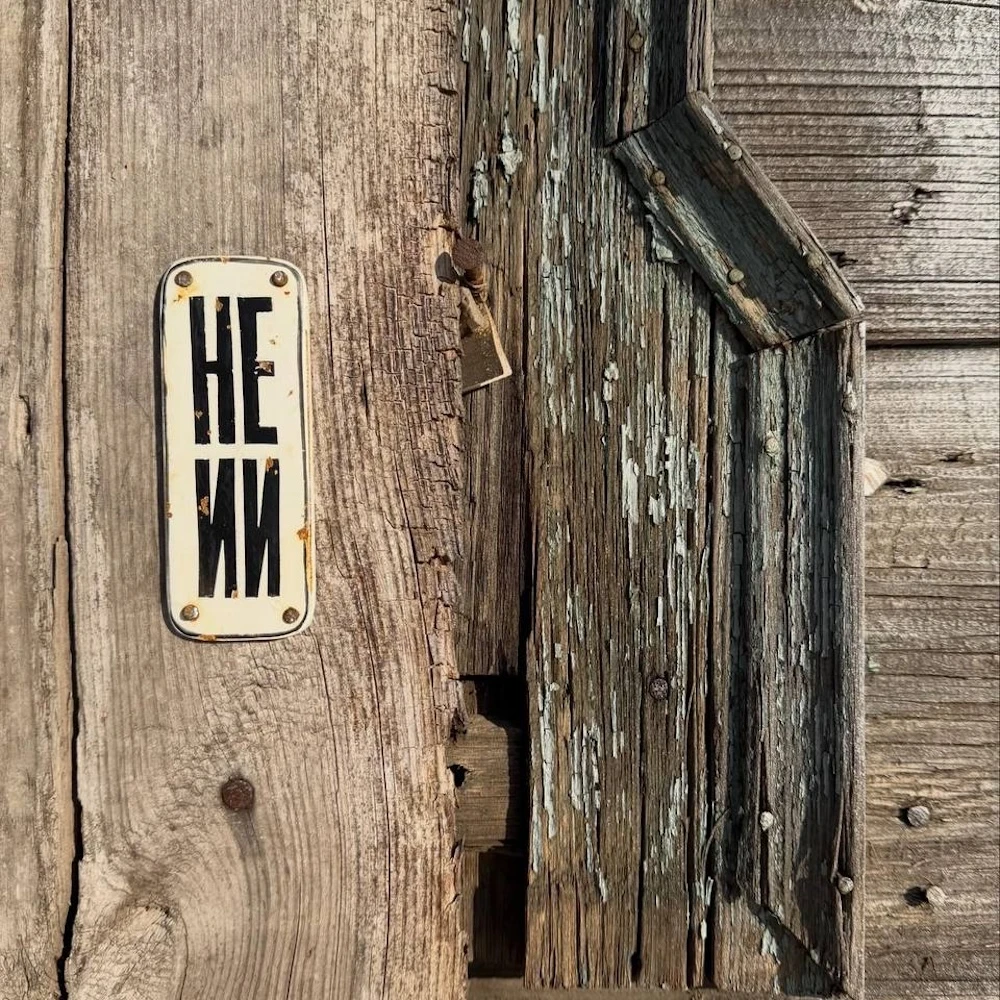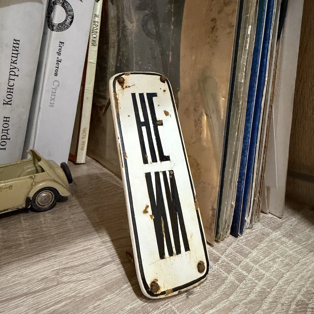 Сделана она в духе старых советских табличек и служебных надписей: строгий шрифт, металлическая основа, немного индустриального настроения. Только вместо привычного «не курить» или «посторонним вход воспрещён» здесь появляется аккуратная ирония над нашим временем.
