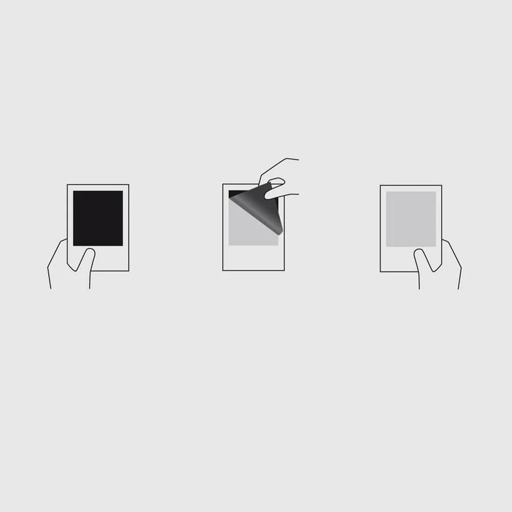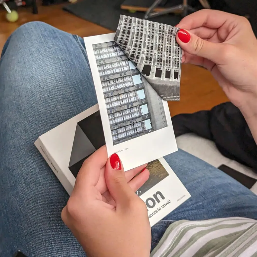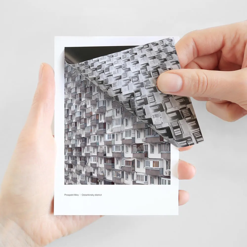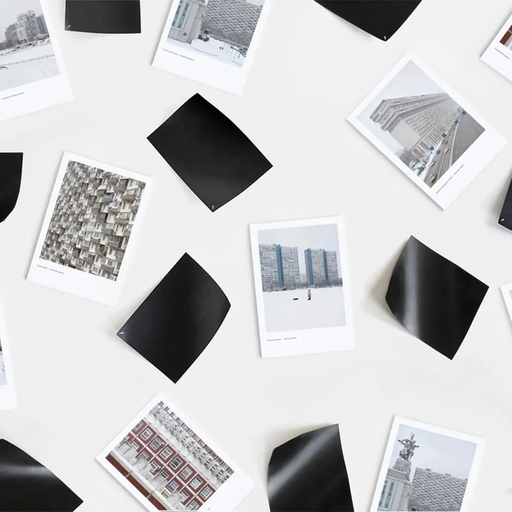 Главная особенность набора заключается в том, что фотографии скрыты под негативами. Необходимо снять специальную пленочку и потрясти открытку в стиле «полароида».
