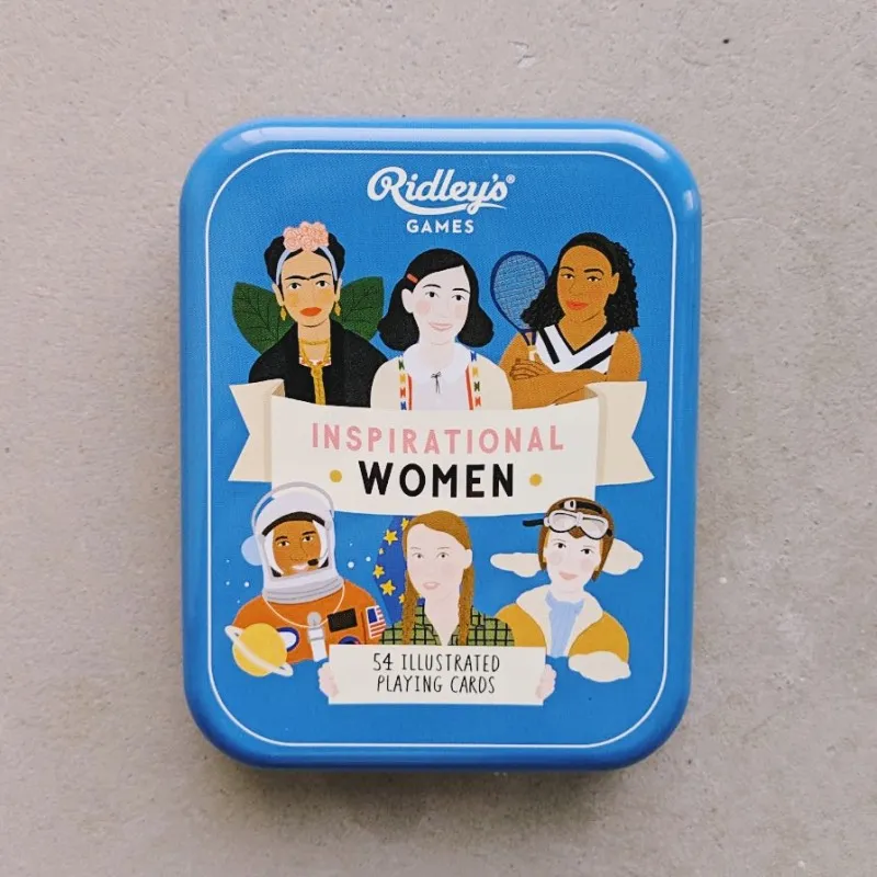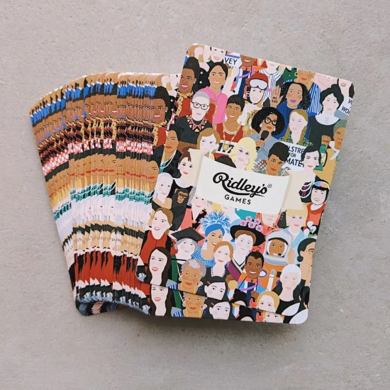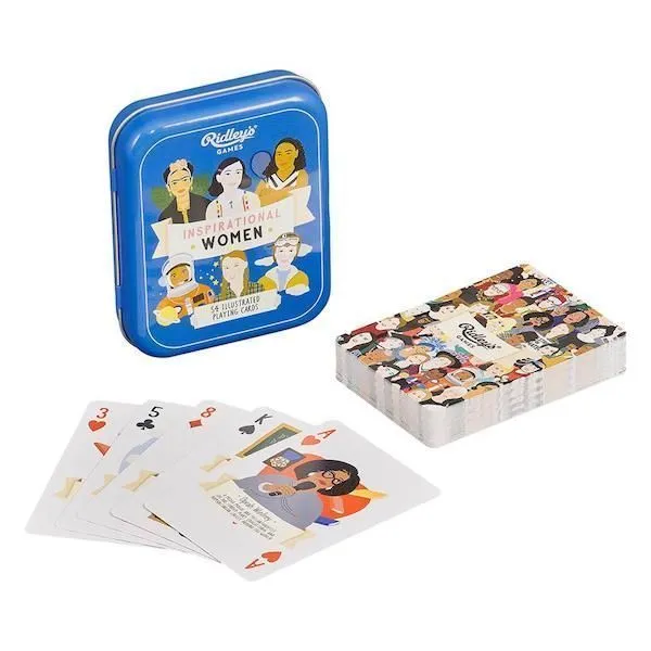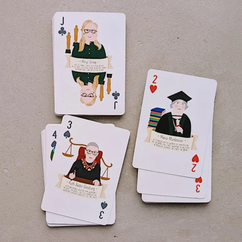 - 54 красивые иллюстрированные игральные карты с разными вдохновляющими женщинами и кратким описанием их биографии.