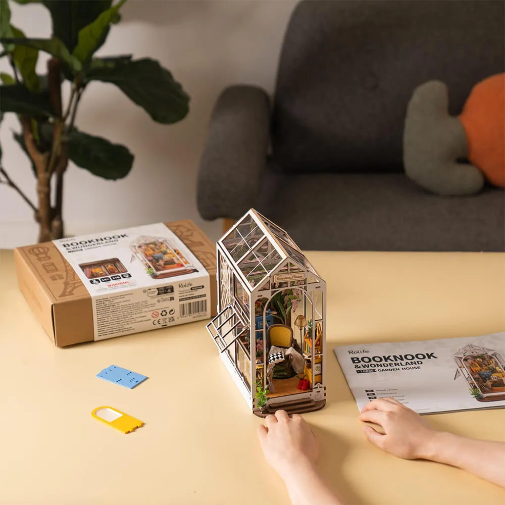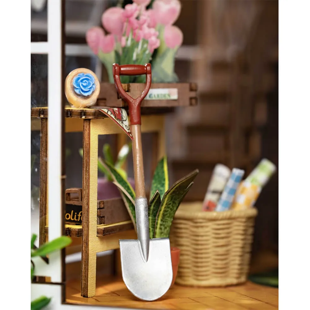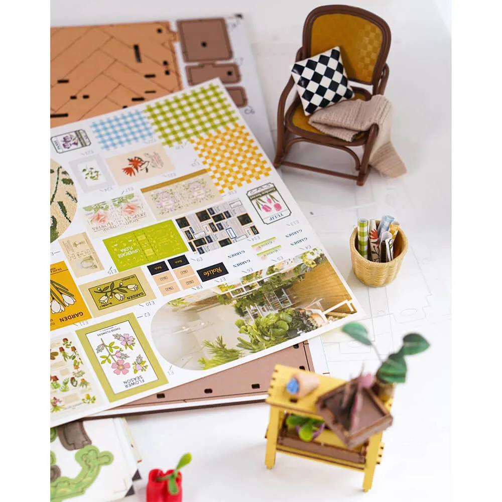 Румбокс интерьерный Garden House - сборная модель очаровательного миниатюрного цветочного домика, который идеально подходит для хорошей книги и чашечки кофе. Маленькие растения, цветы, вазы, кашпо, деревянные шкафчики и множество фотографий и картин делают его идеальным подарком садоводу.
