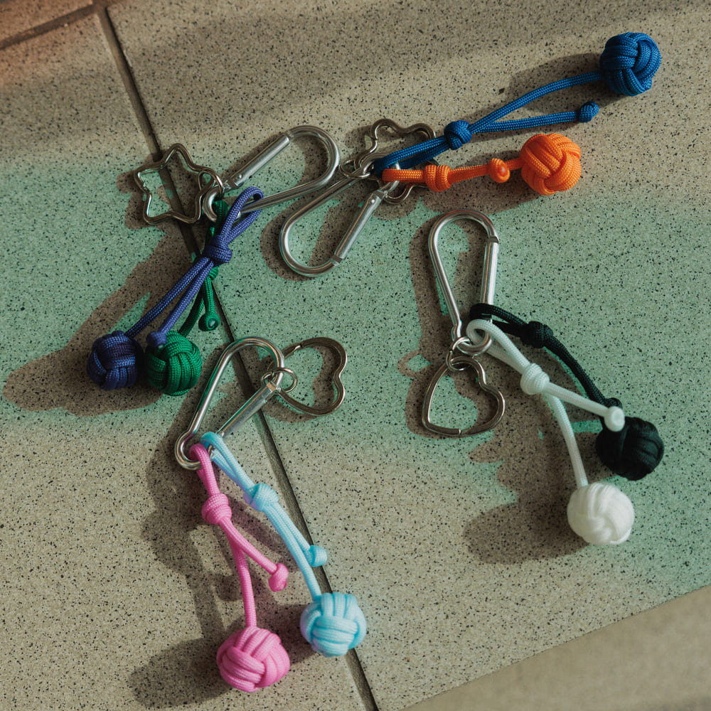 - Плетеные шарики из двух цветов, с кольцами разных форм и карабином.