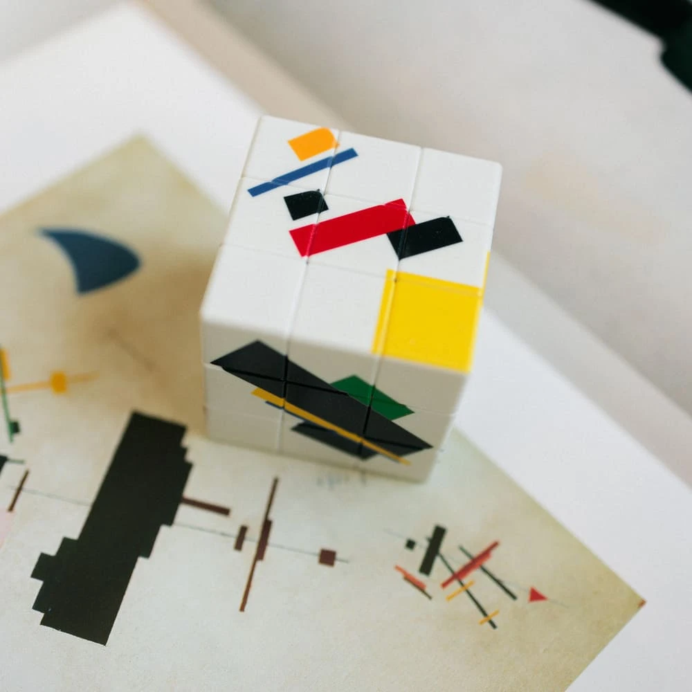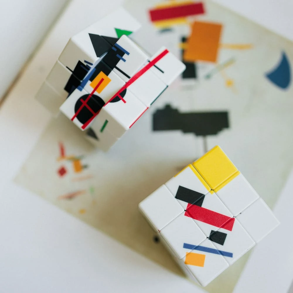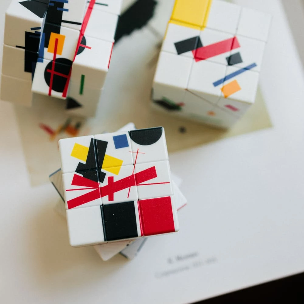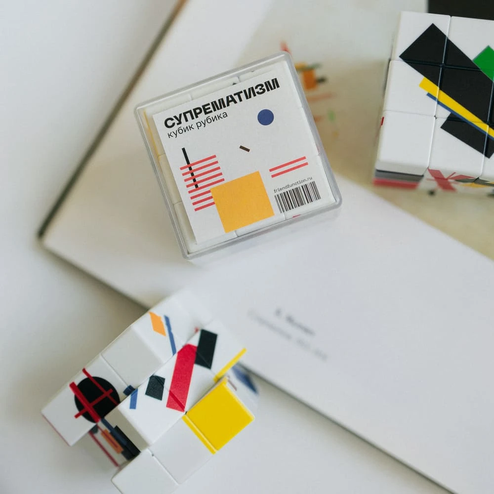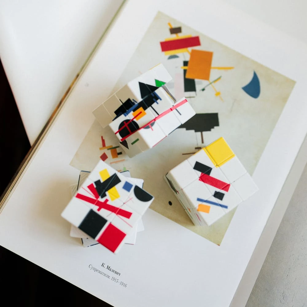 Кубик Рубика в стиле супрематизма, вдохновлённый художественным языком Малевича. Чистые формы и базовые цвета, минимум лишнего, максимум идеи: игра как авангардная медитация.