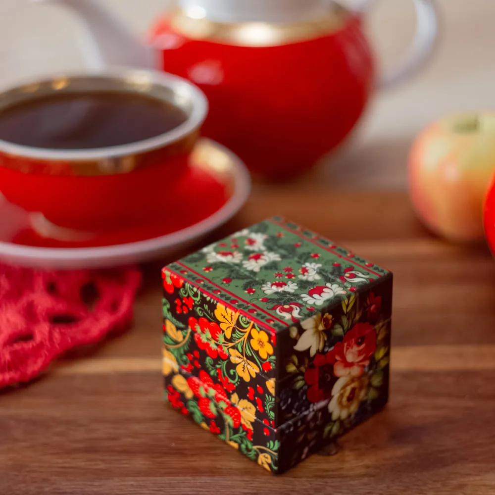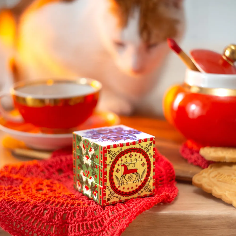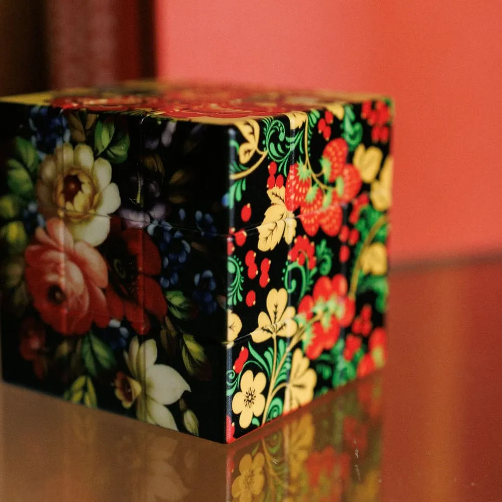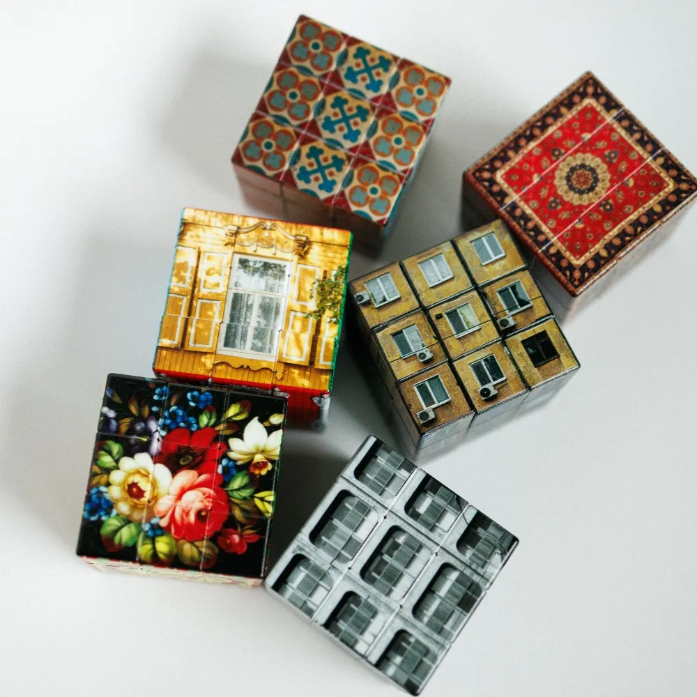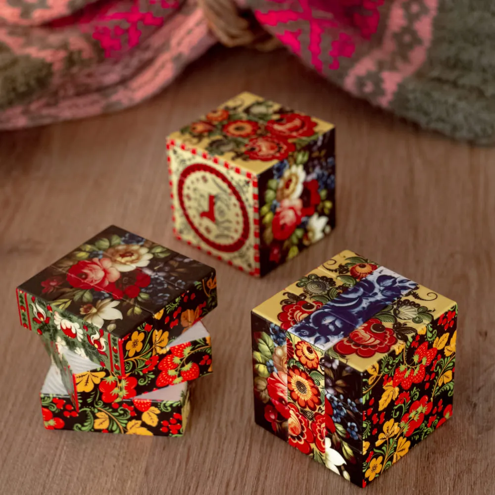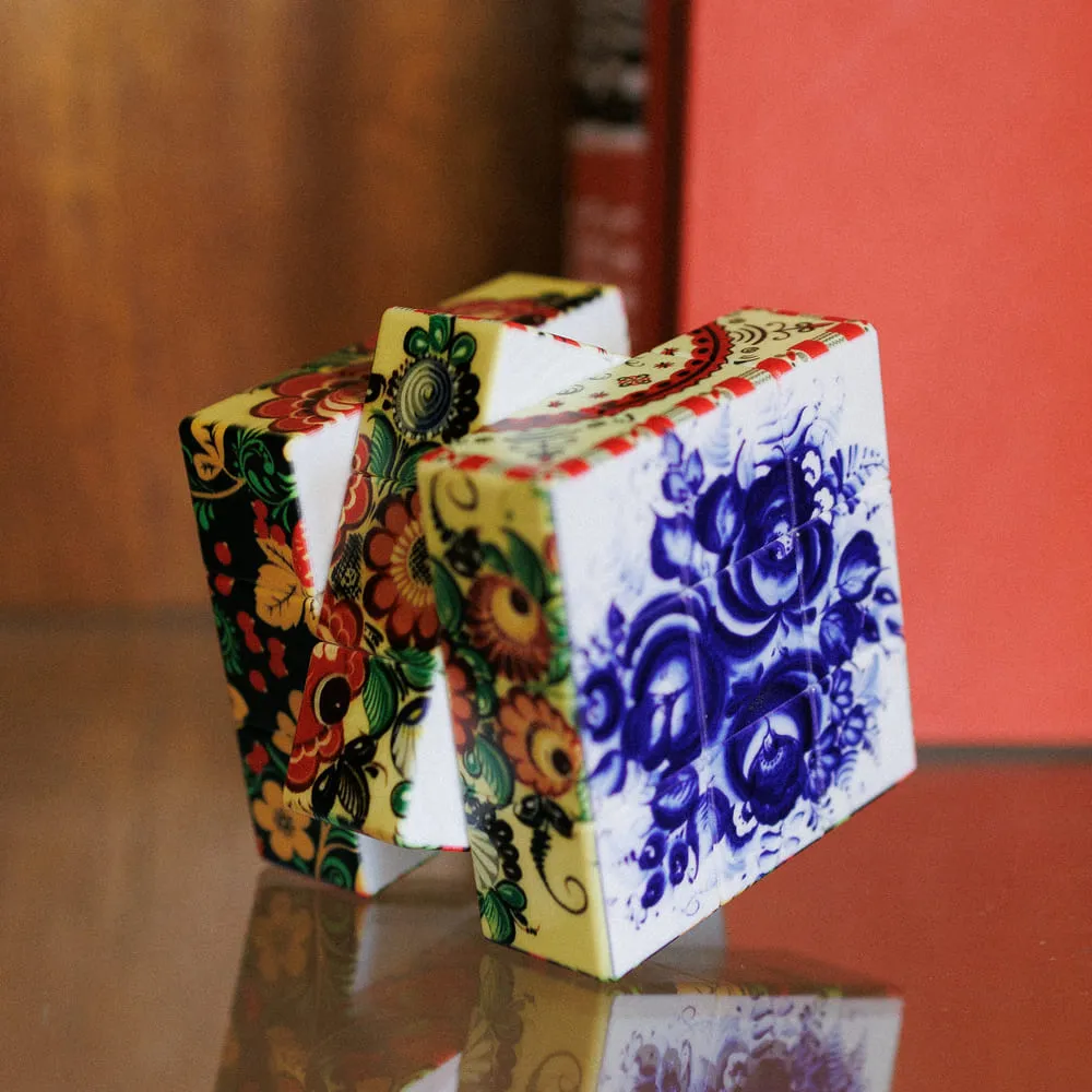 Переосмысленный кубик Рубика: теперь вместо ярких цветов — узоры, будто с платка, ковра или расписной посуды.
