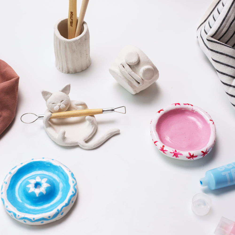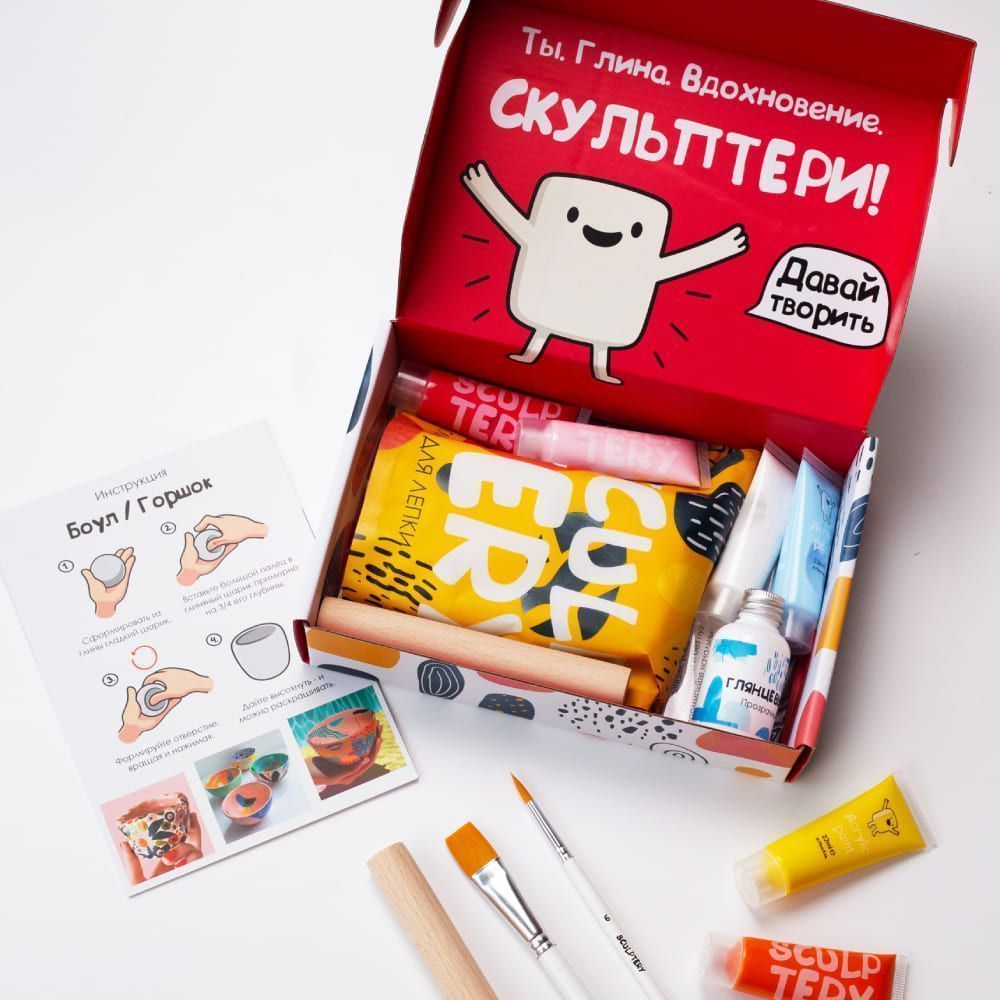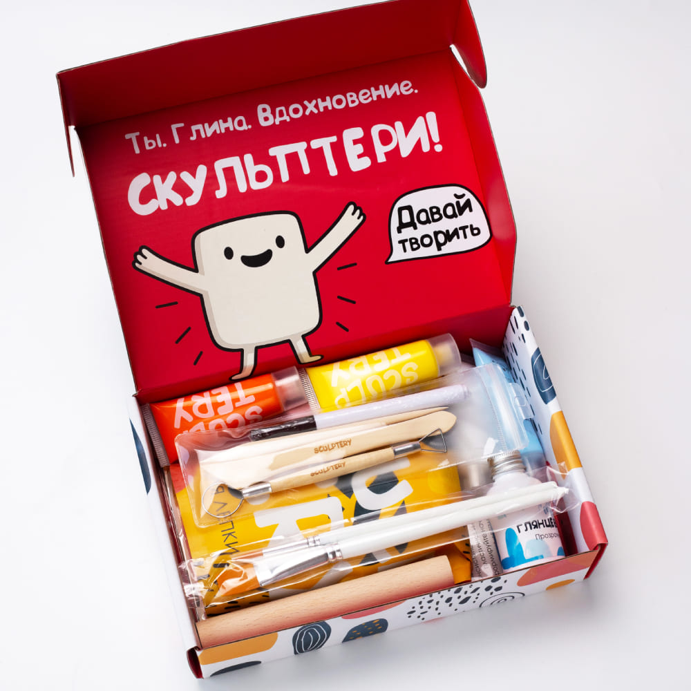 В наборе есть всё необходимое, чтобы сразу начать творить: качественная самозастывающая белая эко глина, инструменты-стеки, акриловые краски и маркер, глянцевый лак, доска для лепки и подробная инструкция.