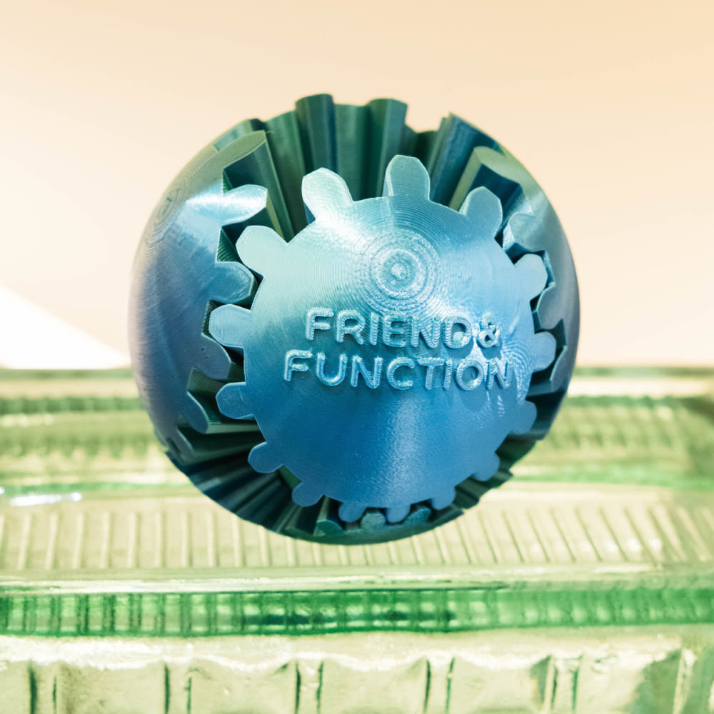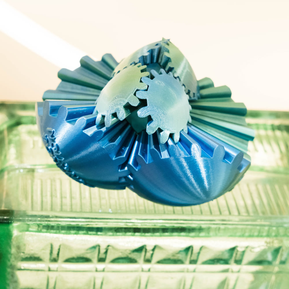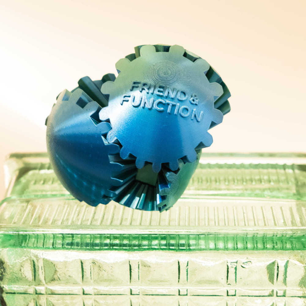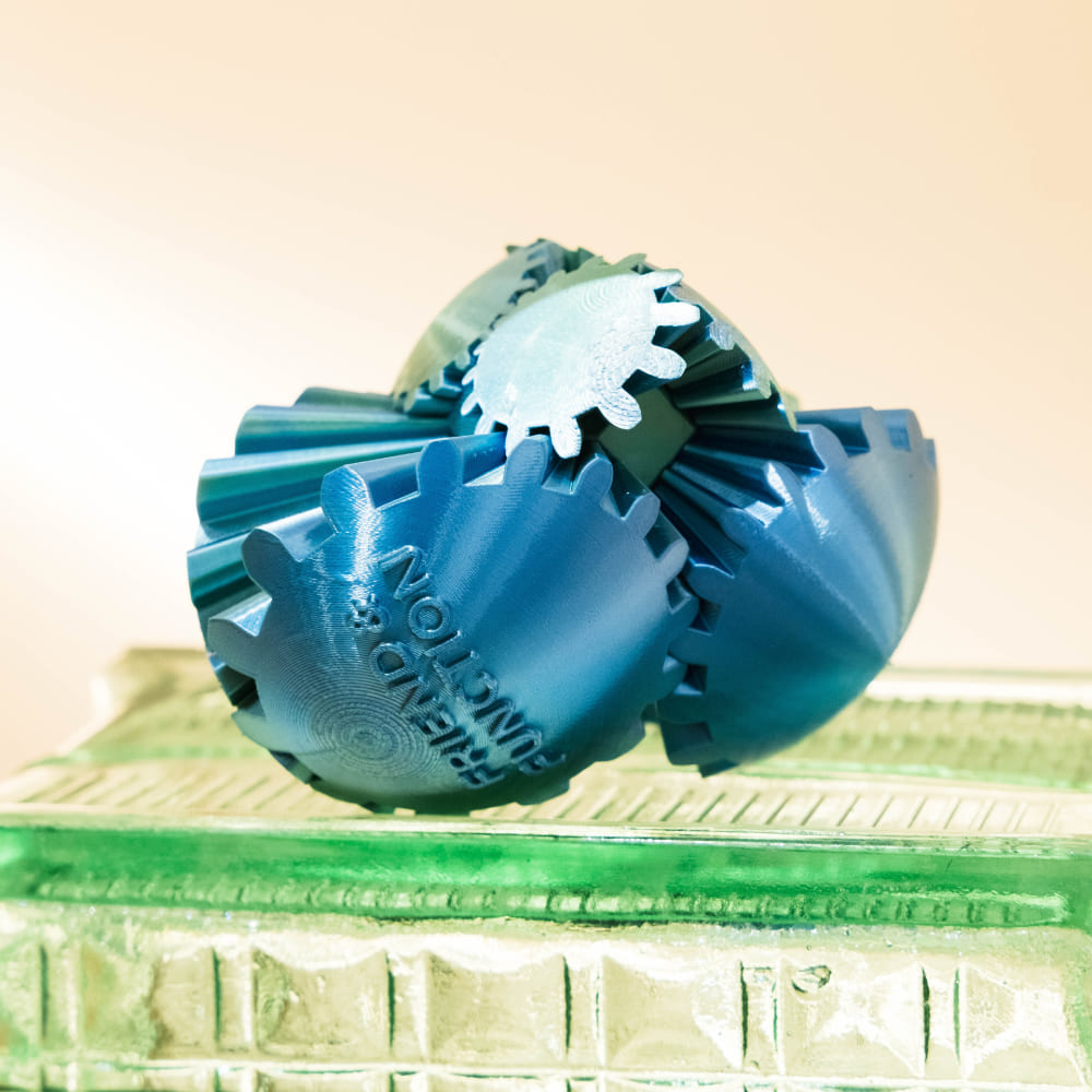 3D-печатный шар с шестерёнками — это и дизайнерский объект, и необычная игрушка-головоломка. При вращении половинки шара плавно трансформируются, открывая внутренний механизм и создавая завораживающий эффект движения.