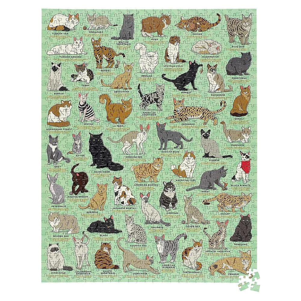 Пазл содержит 54 искусно нарисованных вручную иллюстрации кошек и интересные характеристики каждой породы.