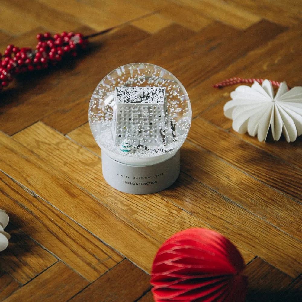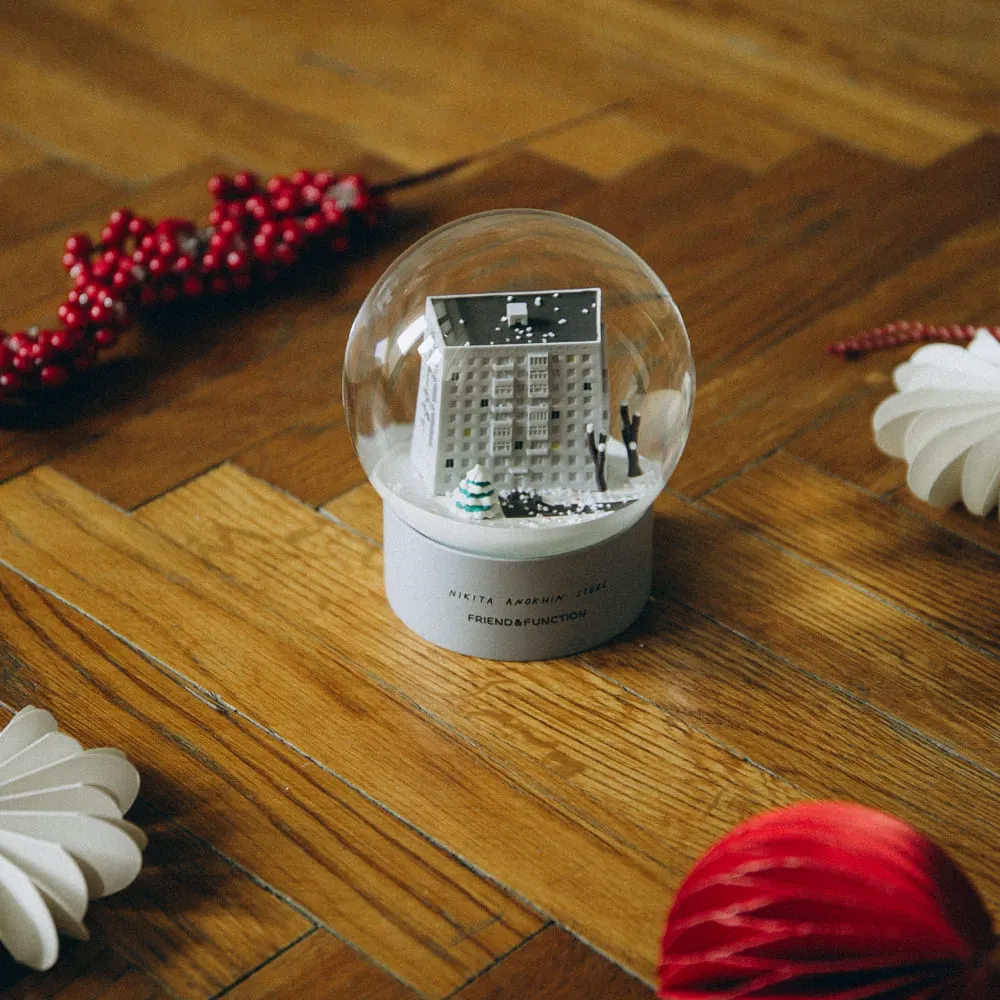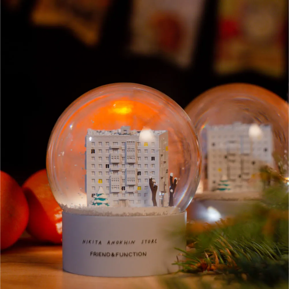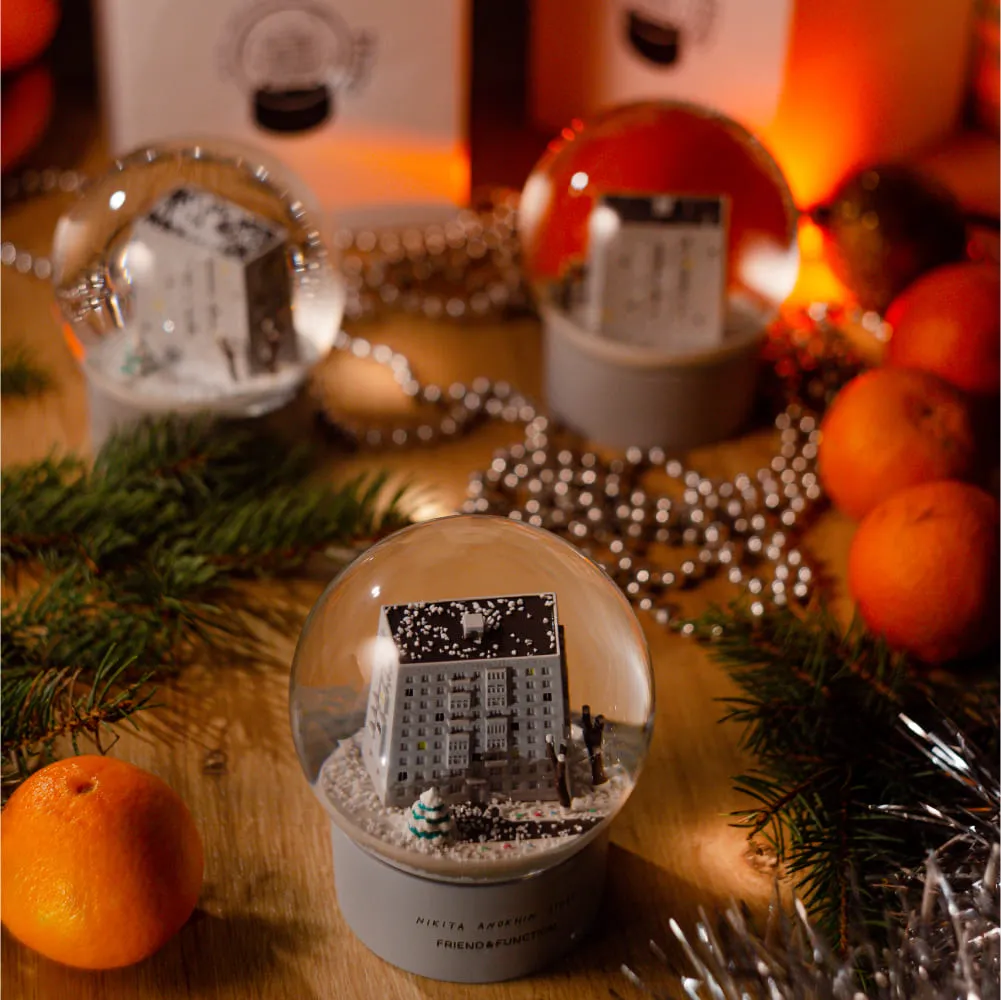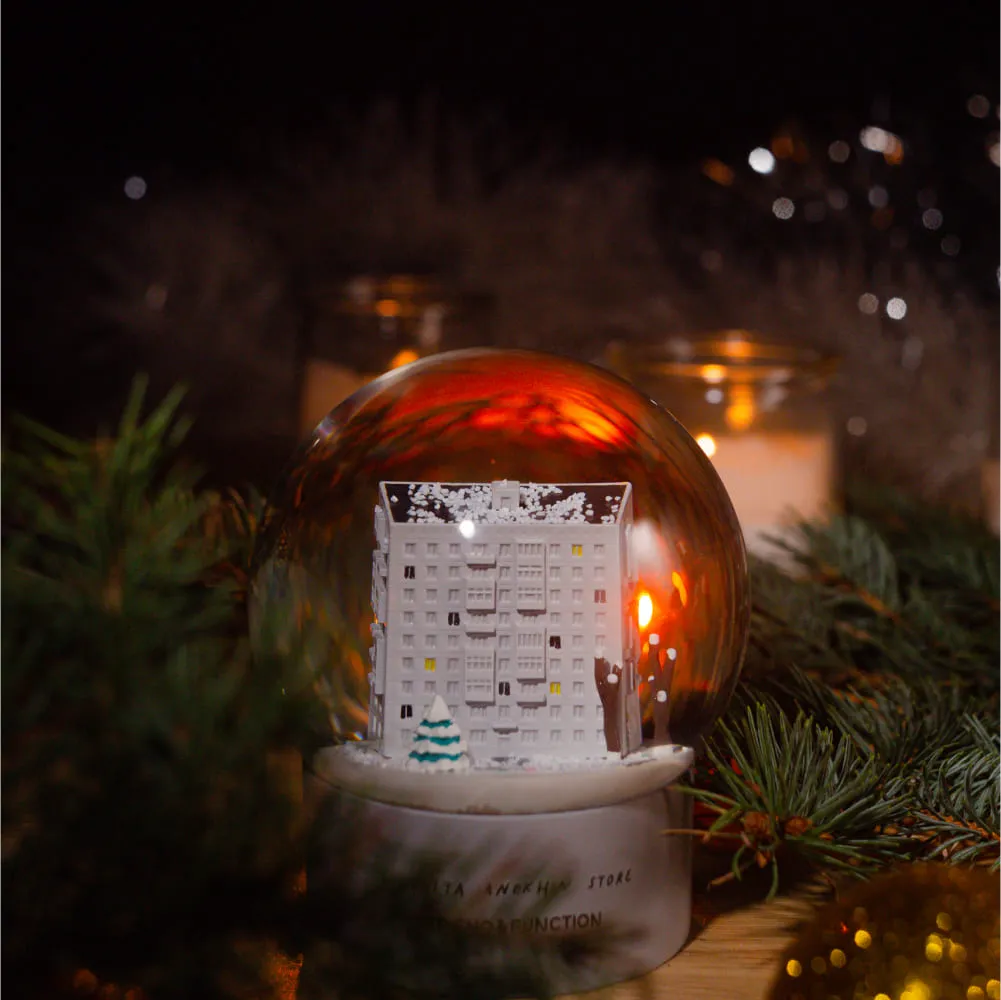 Снежный шар Panelka — результат креативной коллаборации брендов Anokhin Store и Friend Function, который воплощает в себе урбанистическую эстетику и ностальгию по архитектуре советских времен. Внутри шара — детализированная модель панельной девятиэтажки, окруженная мягкими снежными вихрями, иллюстрирующими родной зимний городской пейзаж.
