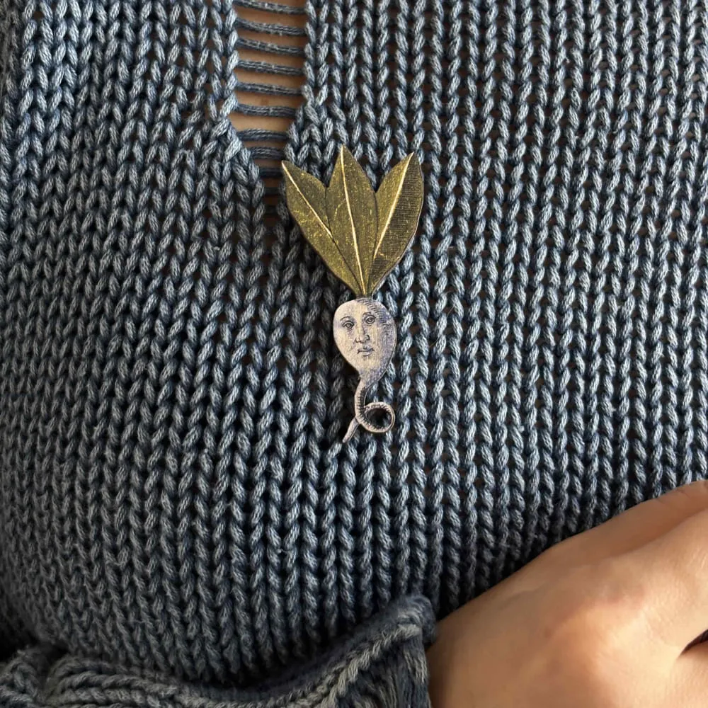 - 3 броши из дерева с цветной печатью и надежным креплением в виде булавки на шурупах.