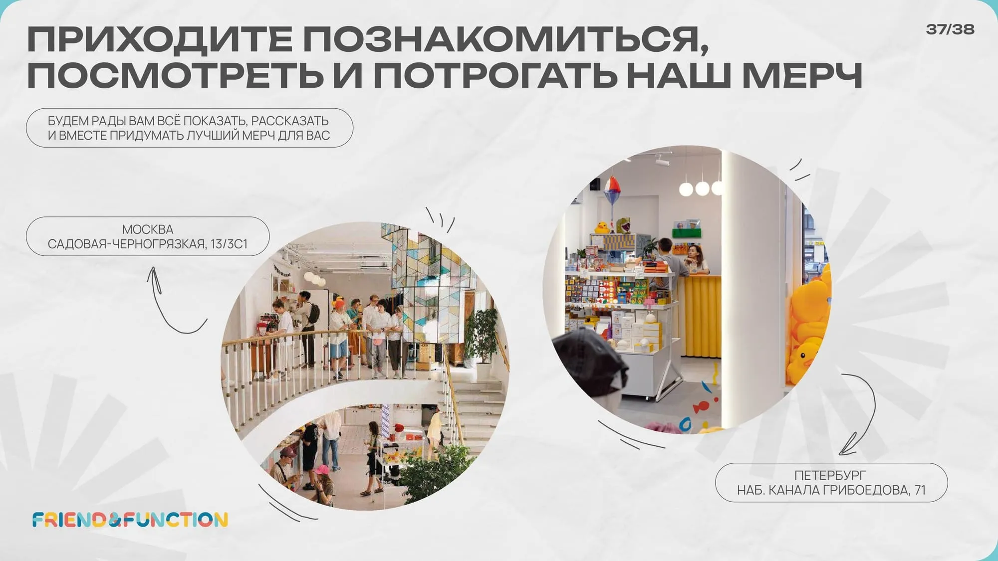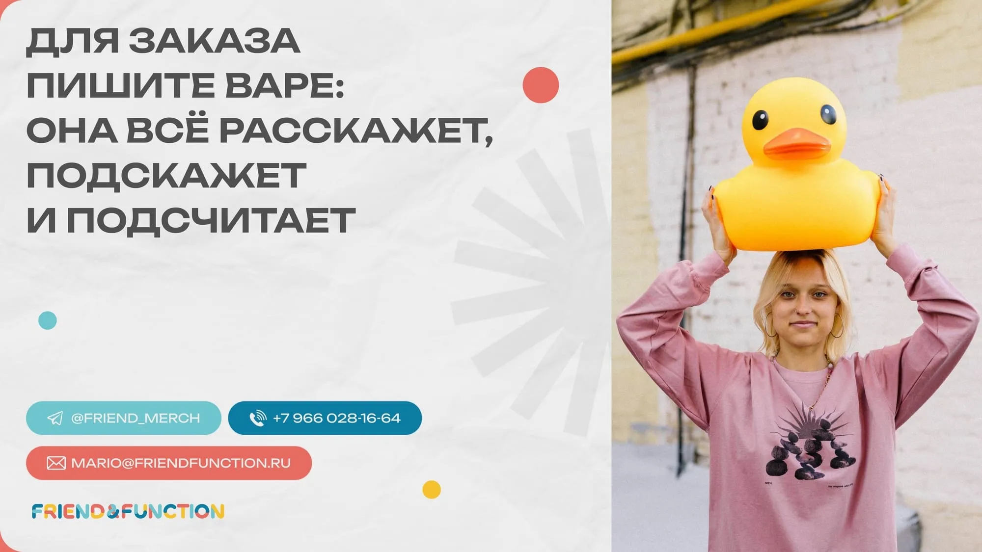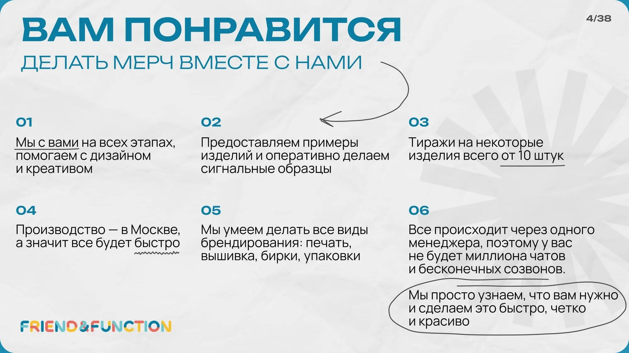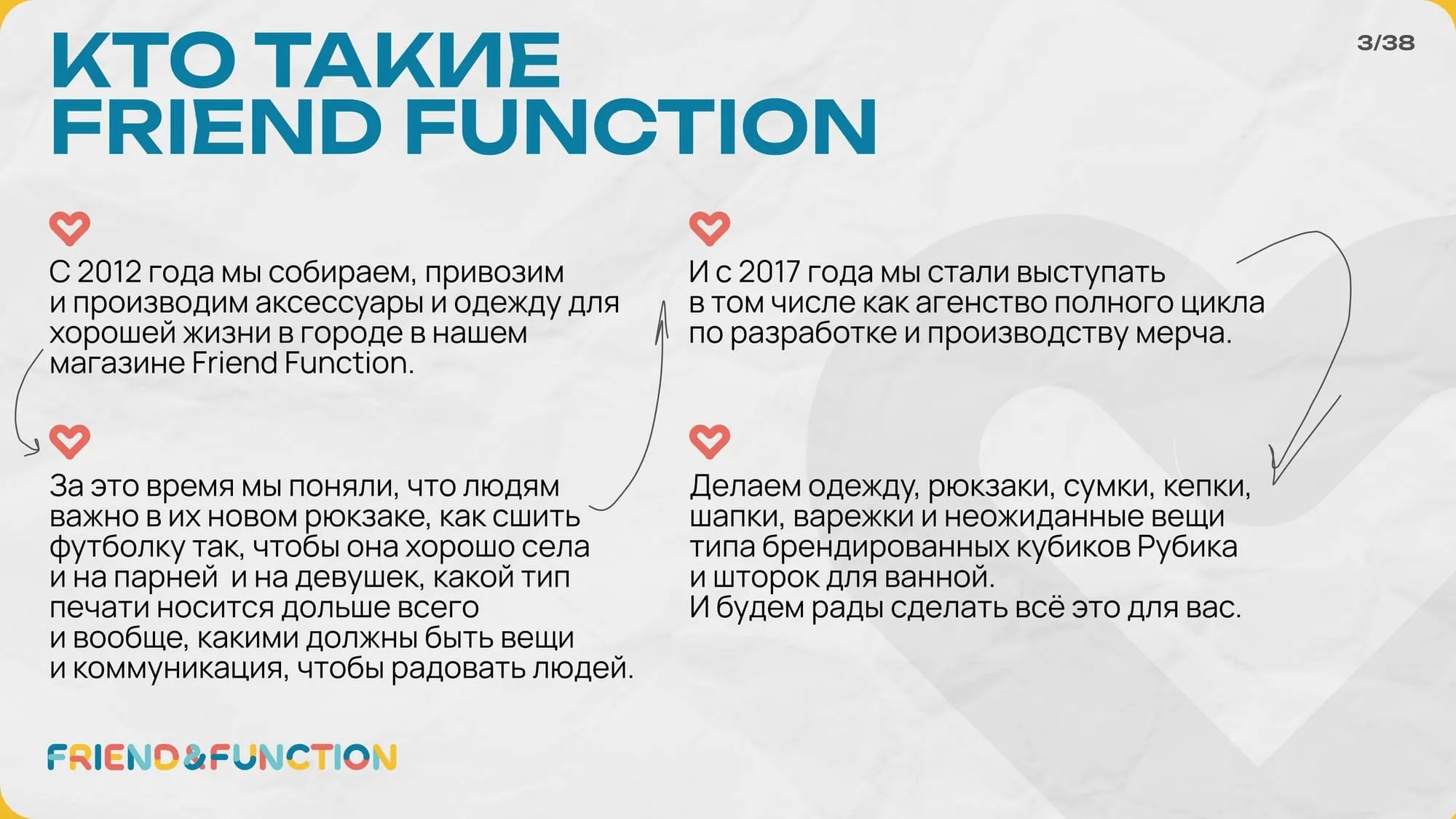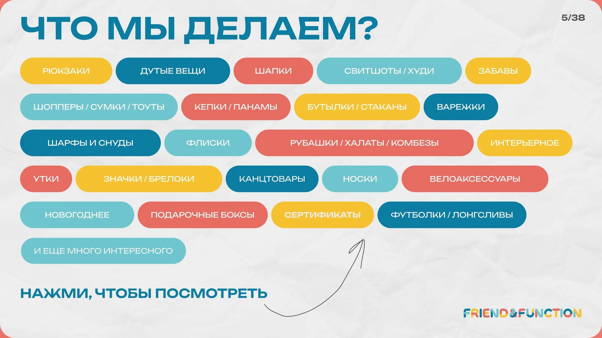 Если вам или кому-то в вашем окружении может быть интересно изготовление мерча на заказ - вот презентация с нашими возможностями. Если вы хотите заказать мерч для компании или сделать копоротивные подарки с нами - пишите на merch@friendfunction.ru